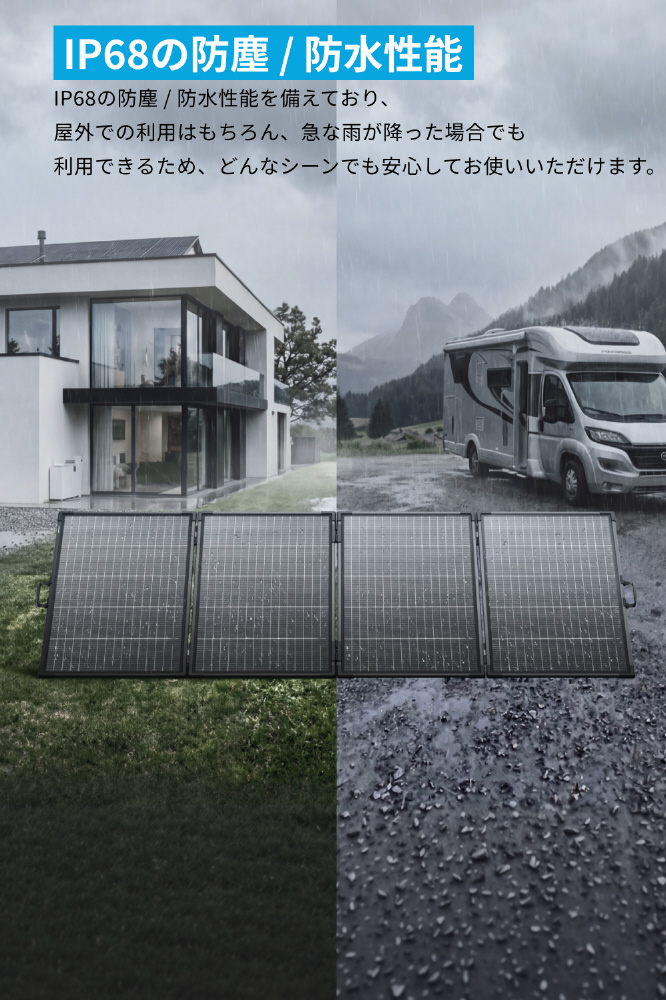 IEC (国際電気標準会議) が定める厳しいテスト基準をクリアし、電子機器の防塵防水性能を示すIP規格に対応しています。IP68レベルに対応しているため、屋外での利用はもちろん、急な雨が降った場合でも利用でき、どんなシーンでも安心してお使いいただけます。