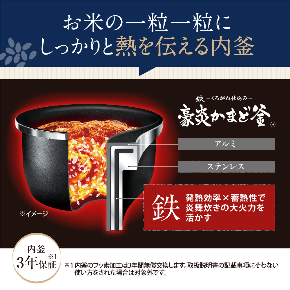 ・IHと相性が良く発熱効率と蓄熱性が高い「鉄」素材を、熱伝導率の高い「アルミ」層と耐久性に優れた「ステンレス」層に組み込んだ内釜です。