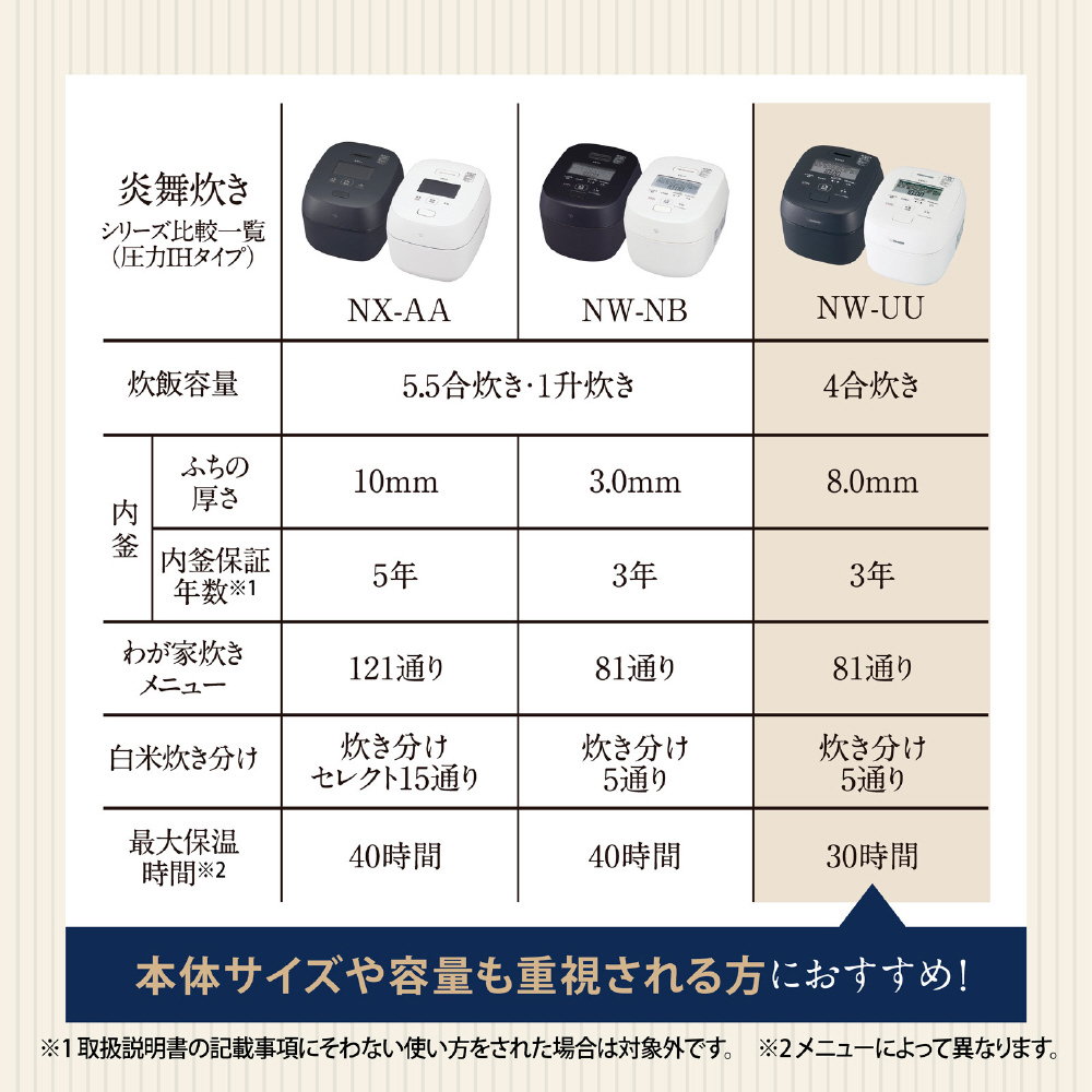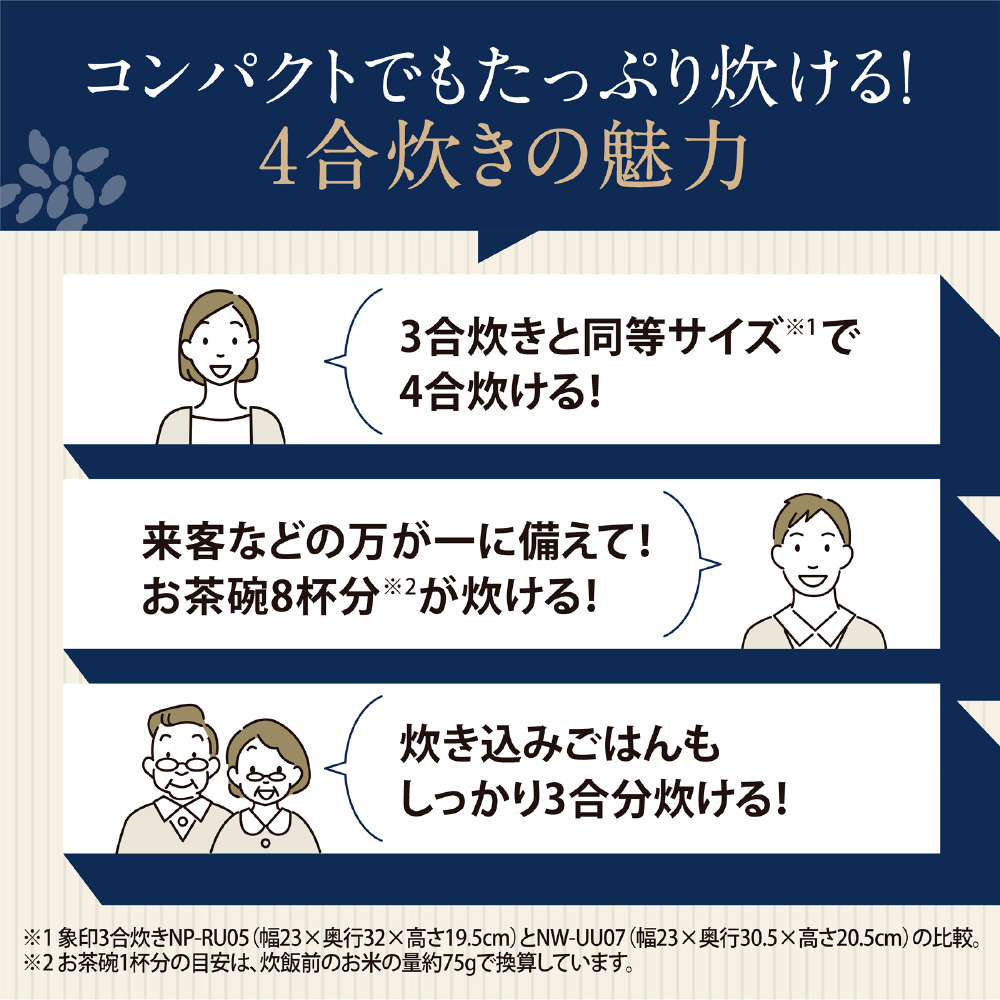 ・本体の大きさは3合炊きタイプと同等ながら、4合まで炊ける新しいサイズ。容量とコンパクト性を両立しました。