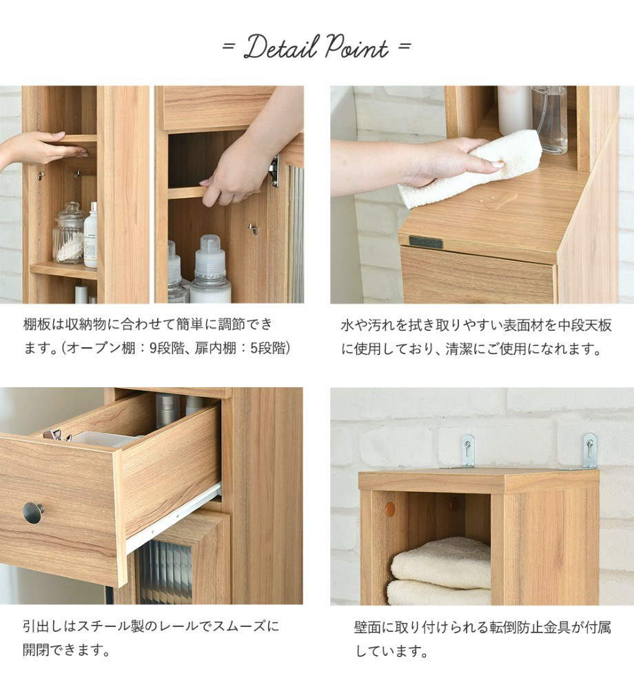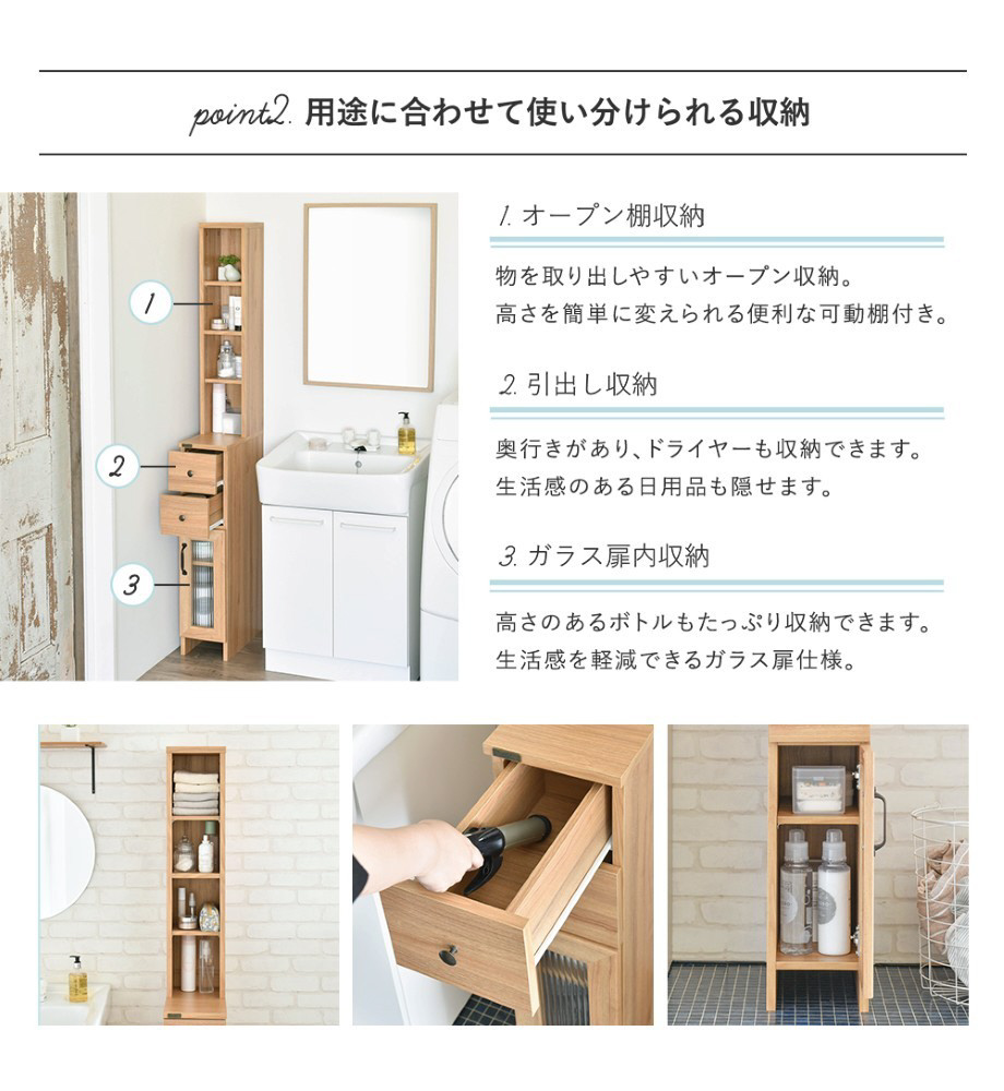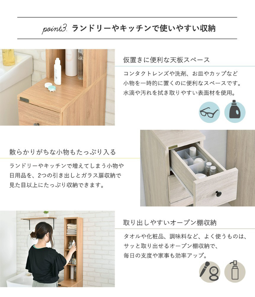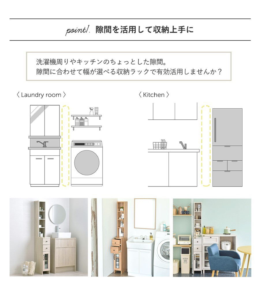 木目調のホワイトカラーがランドリー周りの雰囲気を明るく清潔感あふれる場所に。狭いスペースでもきっちり収納できる収納ラックです。