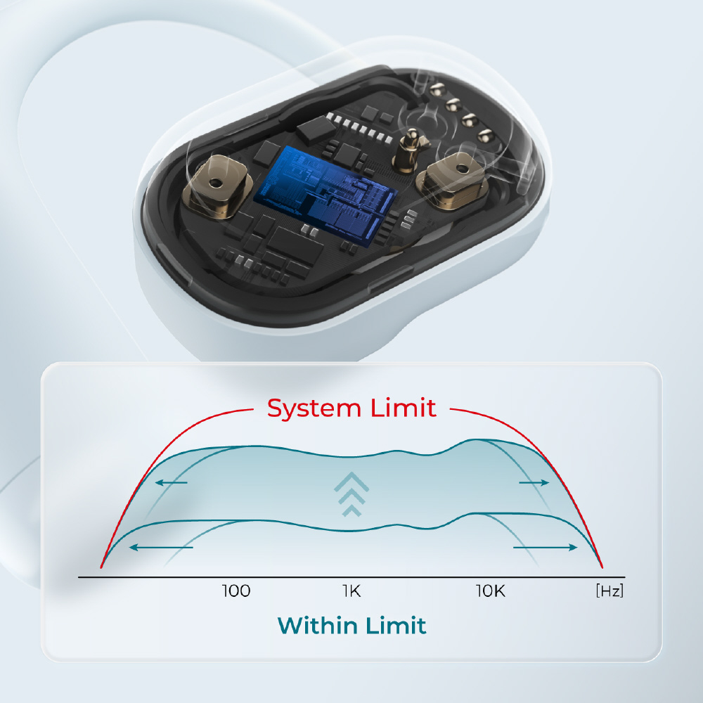 独自の音響アルゴリズムが音声信号をリアルタイムで解析し、イヤホンが無理なく再生できる範囲で自動補正。音量にかかわらず、豊かな低音からクリアな高音まで歪みなく再現します。