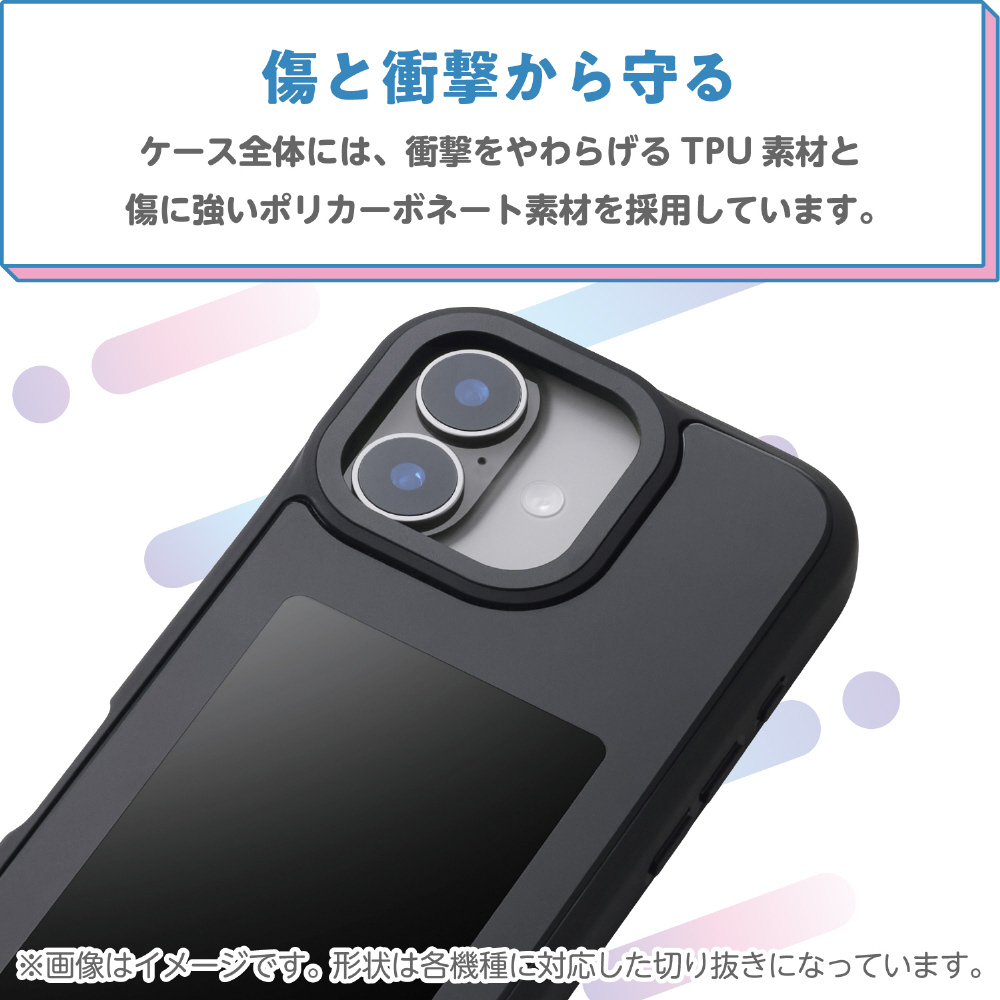 ケース全体には、衝撃をやわらげるTPU(熱可塑性ポリウレタン)素材と、傷に強いポリカーボネート素材を採用しています。