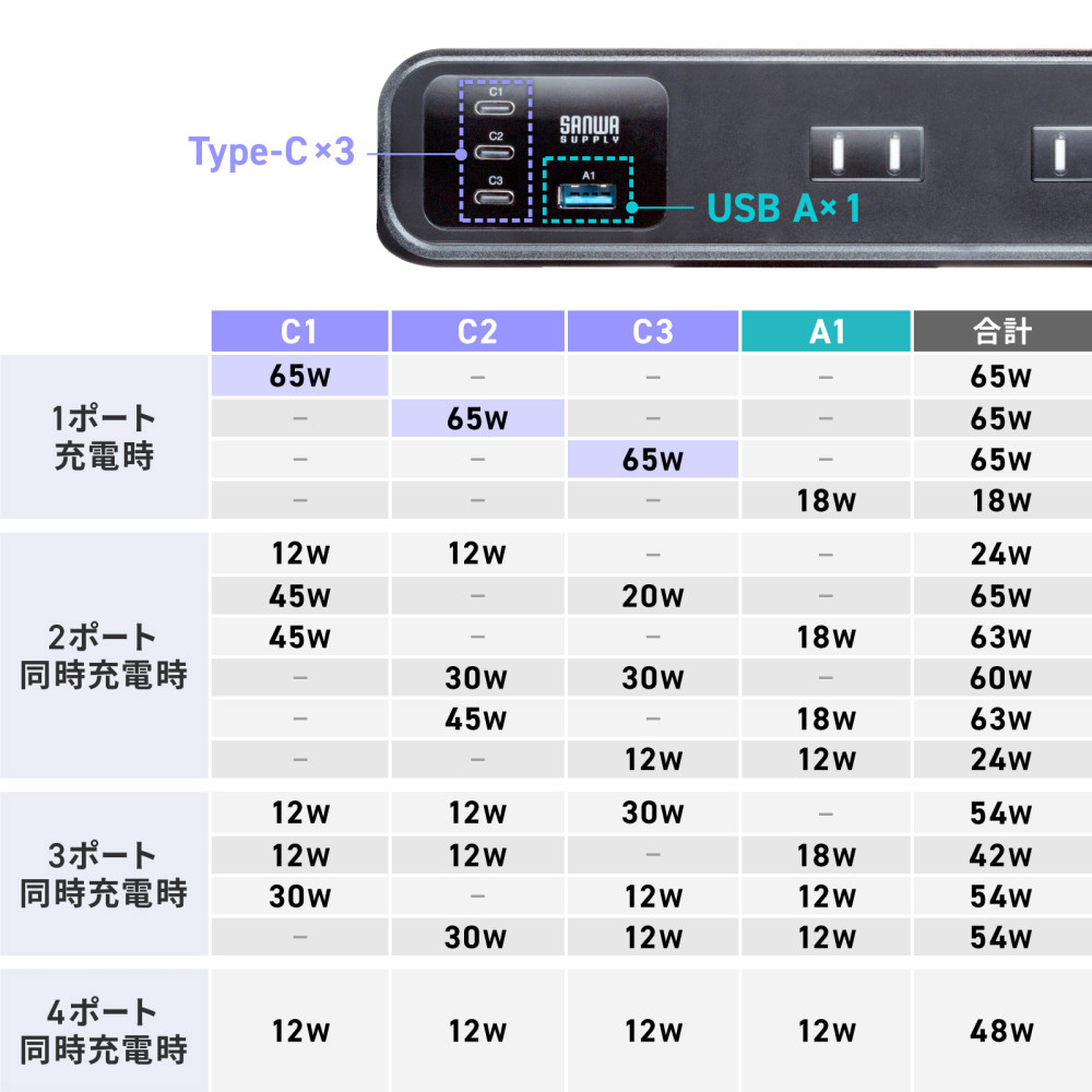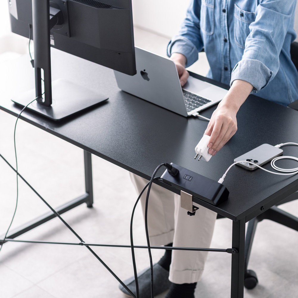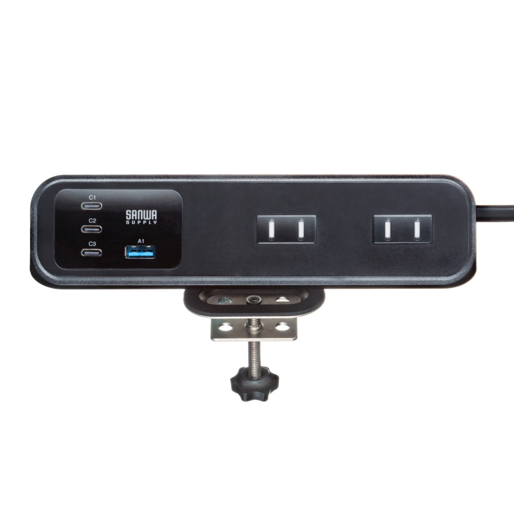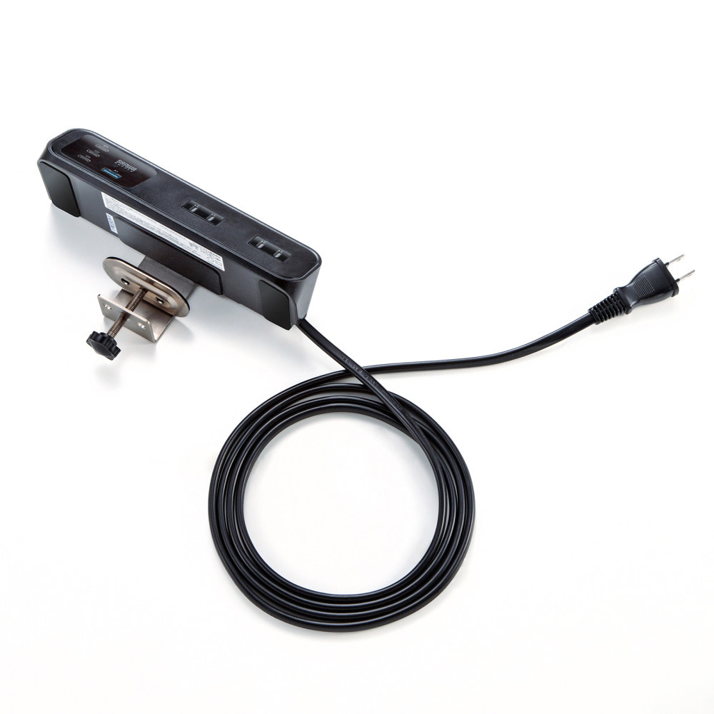 クランプ固定式の電源タップ。USBとACが使え、最大PD65WでノートPCもType-Cで充電可能です。