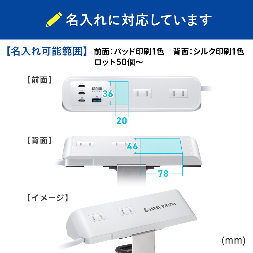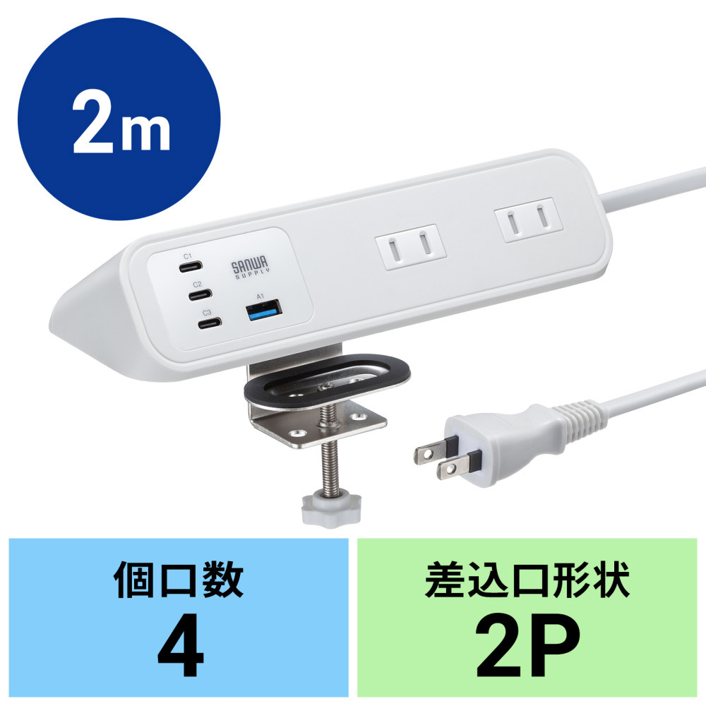| 商品名 | クランプ固定式タップ(AC4個口+USB-C×3+USB-A×1・PD65W・ホワイト) TAP-B114UC-2W 【864】 |