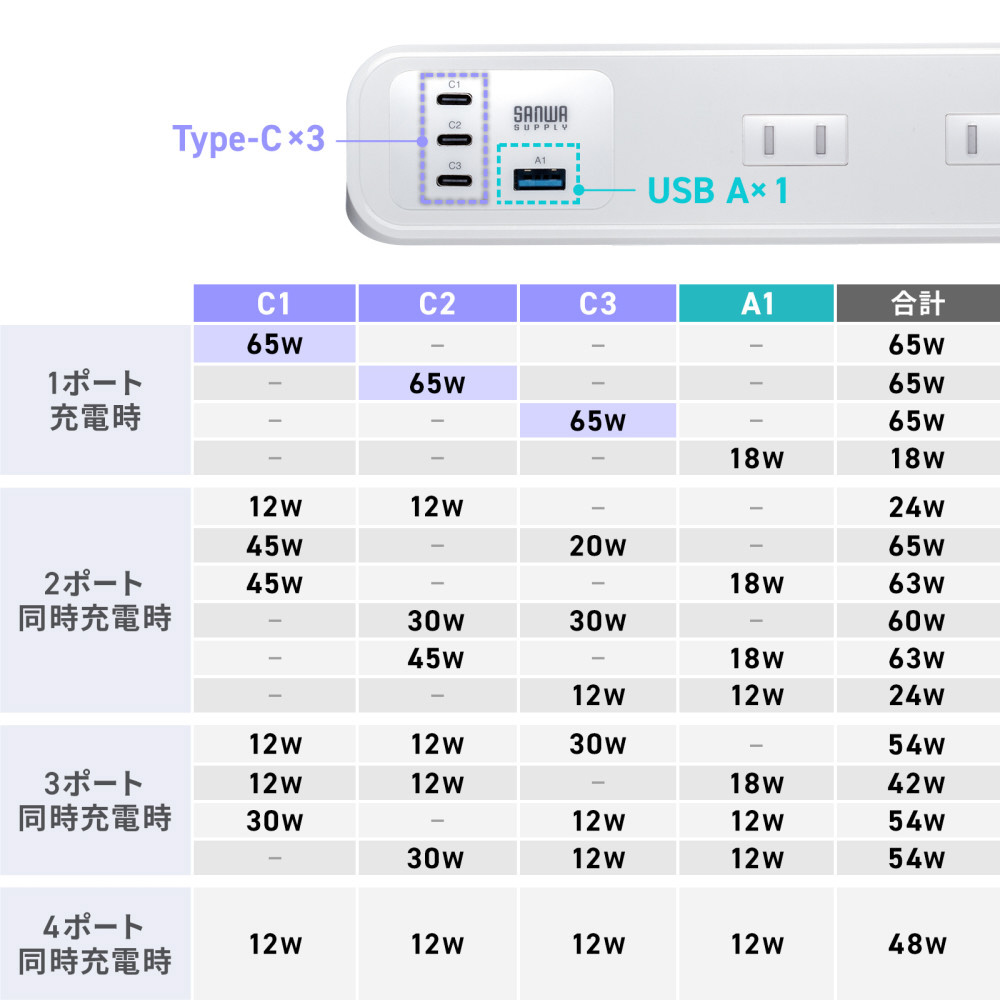 ●USB-Cポート3つとUSB-Aポート1つを備え、最大65WのPD対応でノートPCなども素早く充電できます。