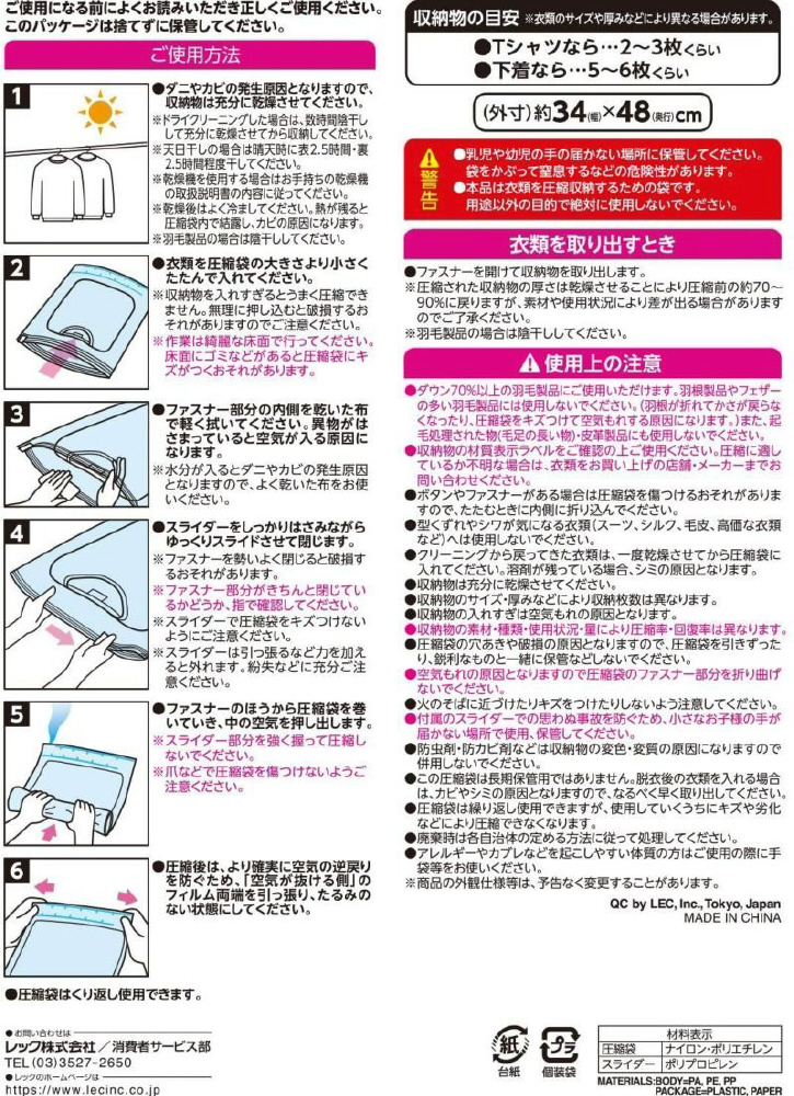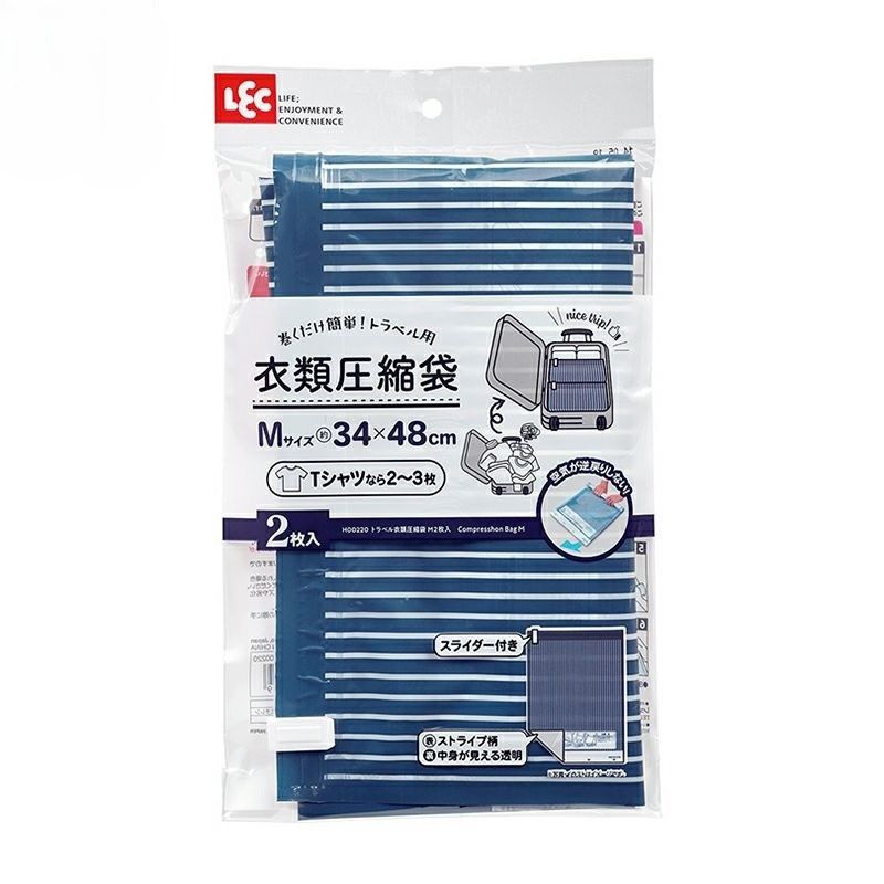 手で巻くだけで、簡単に衣類を圧縮することができます。旅行や出張先でも。かさばる衣類荷物を簡単に圧縮し、カバンのスペースを広げることができます。空気が逆戻りしない逆止弁を採用。ファスナーを閉めやすくするスライダー付きです。表面は中身を見えにくくするストライブ柄。裏面は中身を確認できる透明仕様です。Mサイズ(34×48cm)2枚入り。Tシャツなら2〜3枚くらい、下着なら5〜6枚くらい入ります。