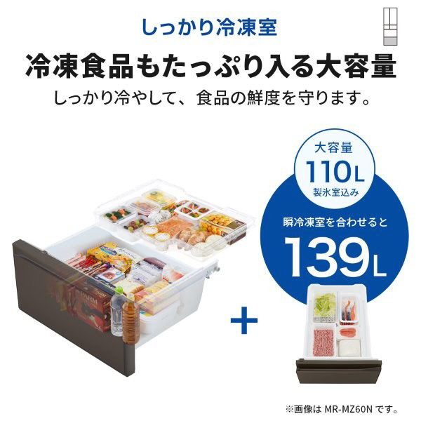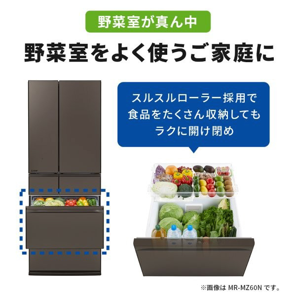 野菜室が真ん中で、出し入れしやすい。中だけひろびろ大容量 MZシリーズ(プレミアムフレンチモデル)。