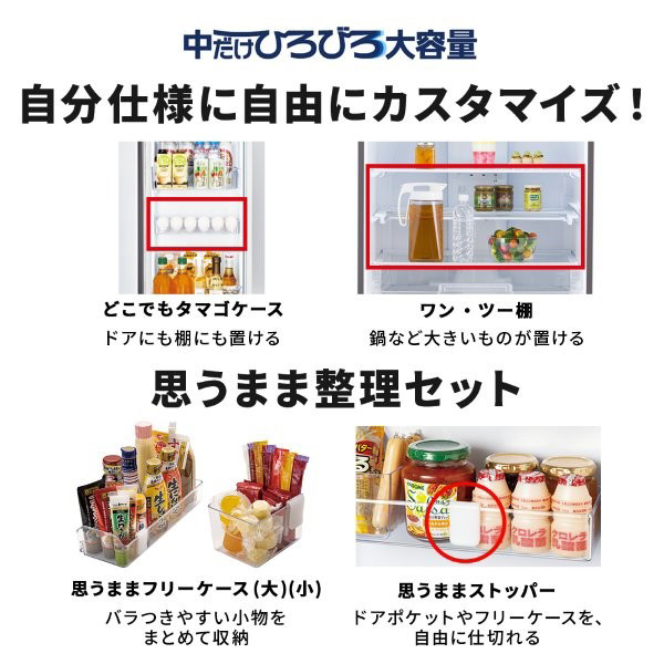 大容量だからまとめ買いも安心。また、棚の高さやドアポケットの仕切りなどを自分仕様にカスタマイズできるので、より自由に、より使いやすくなりました。
