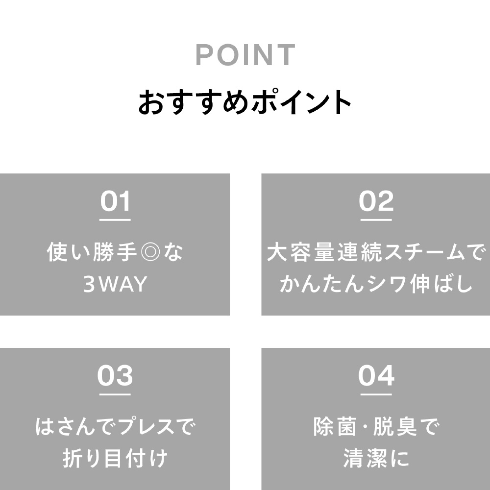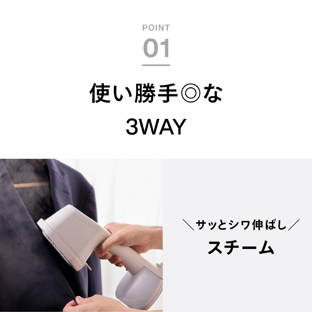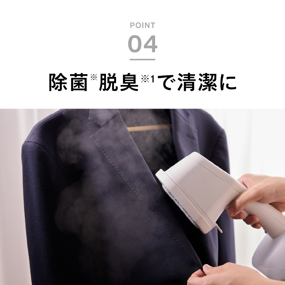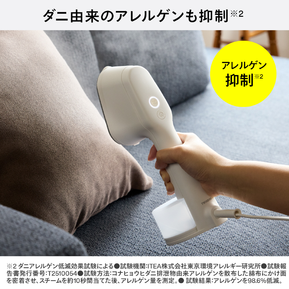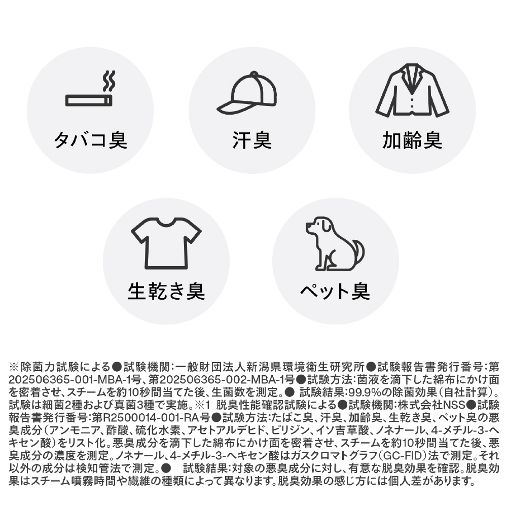 ※1除菌力試験による●試験機関:一般財団法人新潟県環境衛生研究所●試験報告書発行番号:第202506365-001-MBA-1号、第202506365-002-MBA-1号●試験方法:菌液を滴下した綿布にかけ面を密着させ、スチームを約10秒間当てた後、生菌数を測定。● 試験結果:99.9%の除菌効果(自社計算)。試験は細菌2種および真菌3種で実施。※2 脱臭性能確認試験による●試験機関:株式会社NSS●試験報告書発行番号:第R2500014-001-RA号●試験方法:たばこ臭、汗臭、加齢臭、生乾き臭、ペット臭の悪臭成分(アンモニア、酢酸、硫化水素、アセトアルデヒド、ピリジン、イソ吉草酸、ノネナール、4-メチル-3-ヘキセン酸)をリスト化。悪臭成分を滴下した綿布にかけ面を密着させ、スチームを約10秒間当てた後、悪臭成分の濃度を測定。ノネナール、4-メチル-3-ヘキセン酸はガスクロマトグラフ(GC-FID)法で測定。それ以外の成分は検知管法で測定。● 試験結果:対象の悪臭成分に対し、有意な脱臭効果を確認。脱臭効果はスチーム噴霧時間や繊維の種類によって異なります。脱臭効果の感じ方には個人差があります。※3 ダニアレルゲン低減効果試験による●試験機関:ITEA株式会社東京環境アレルギー研究所●試験報告書発行番号:T2510054●試験方法:コナヒョウヒダニ排泄物由来アレルゲンを散布した綿布にかけ面を密着させ、スチームを約10秒間当てた後、アレルゲン量を測定。● 試験結果:アレルゲンを98.6%低減。