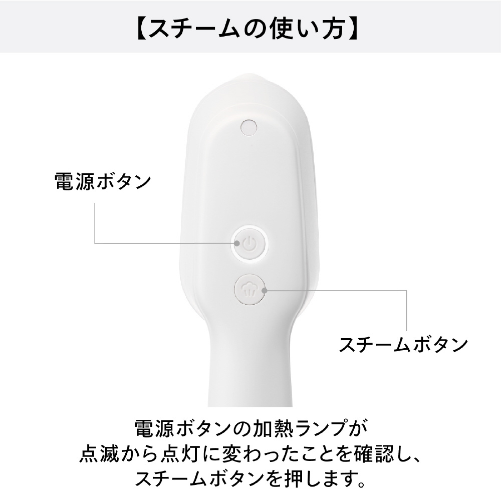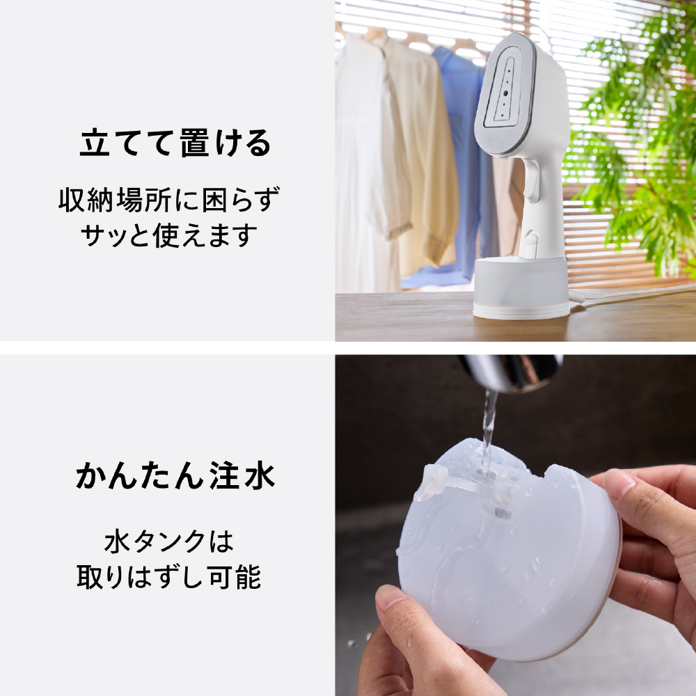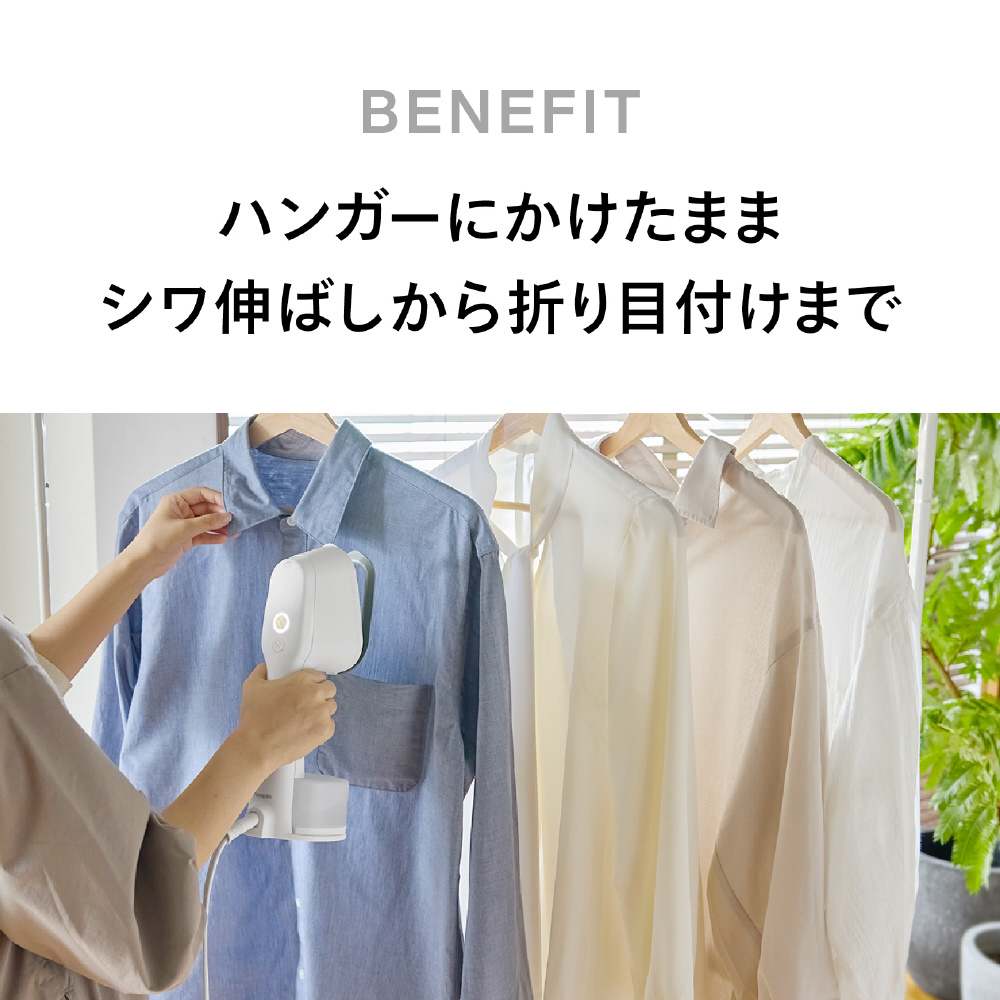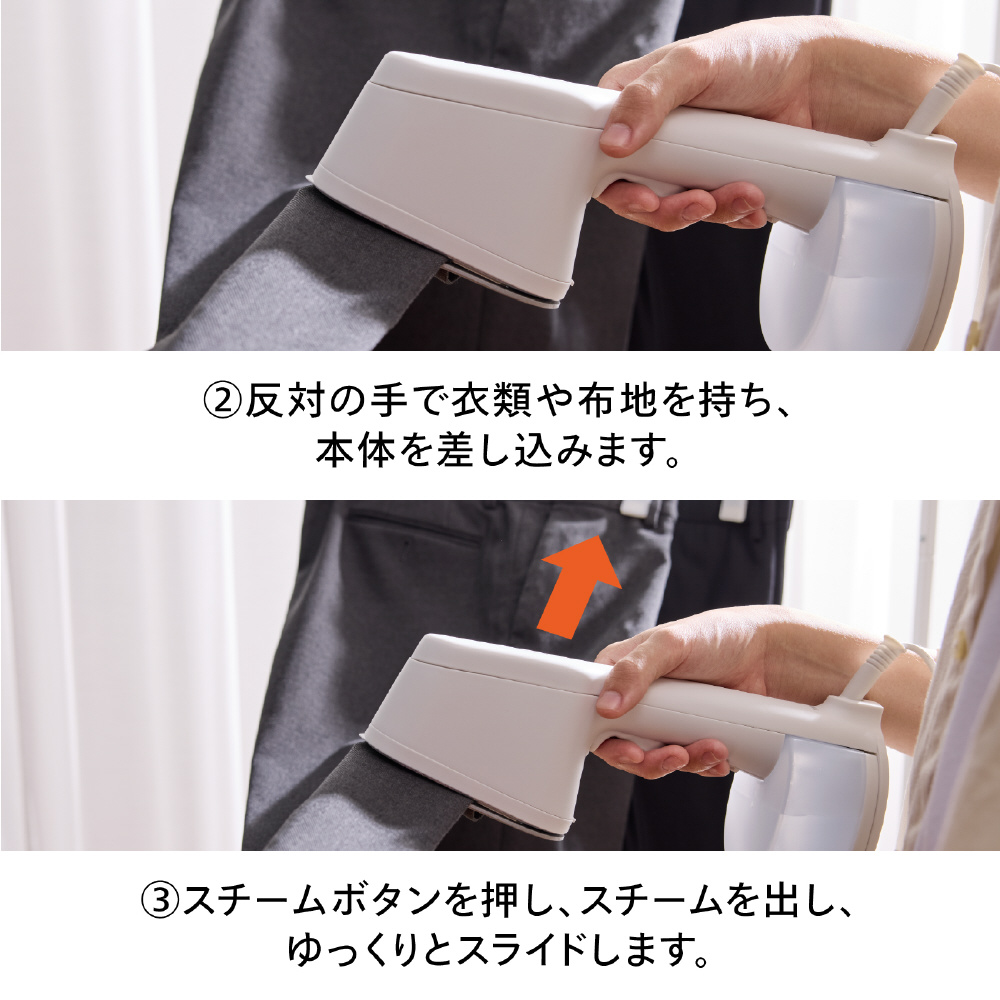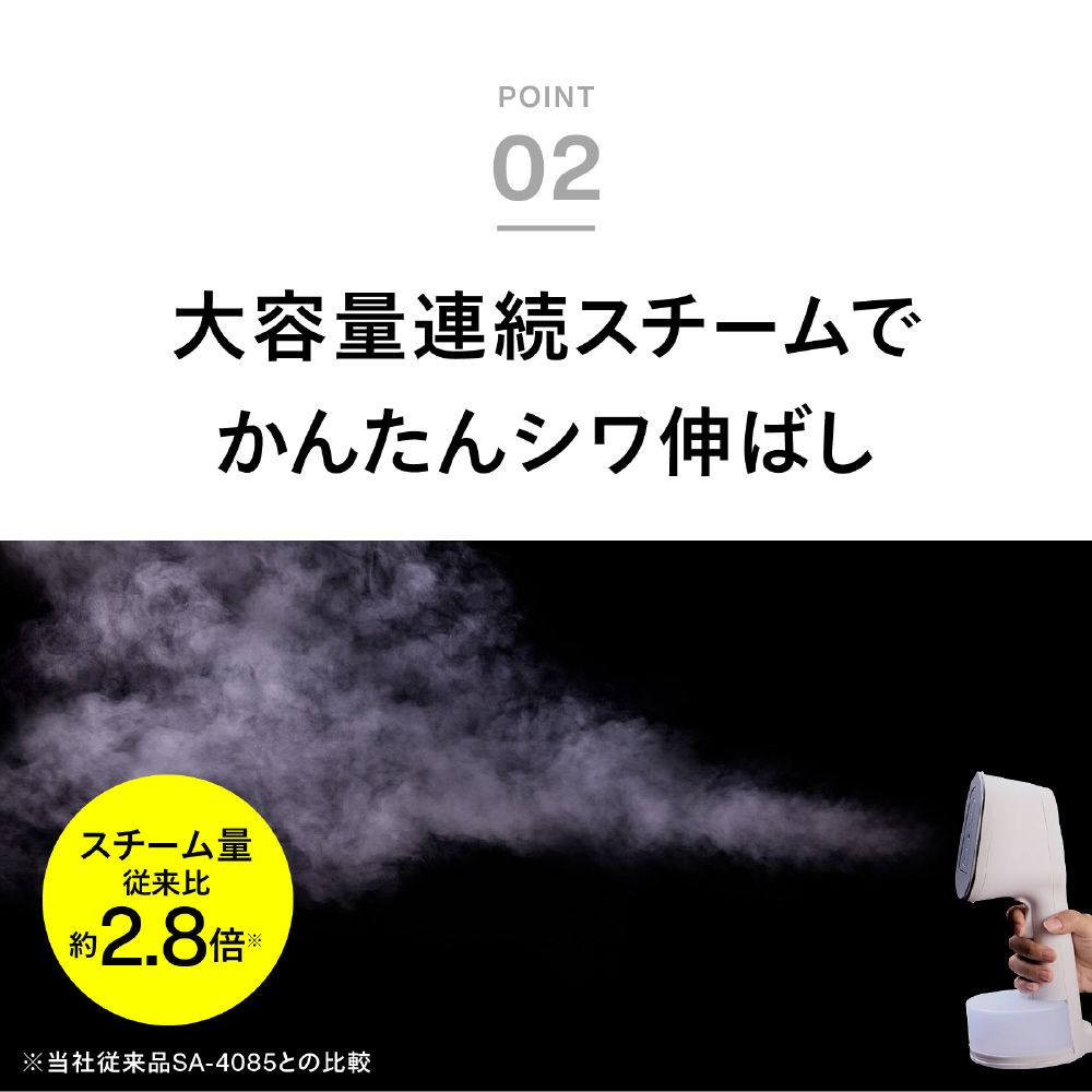 ※1除菌力試験による●試験機関:一般財団法人新潟県環境衛生研究所●試験報告書発行番号:第202506365-001-MBA-1号、第202506365-002-MBA-1号●試験方法:菌液を滴下した綿布にかけ面を密着させ、スチームを約10秒間当てた後、生菌数を測定。● 試験結果:99.9%の除菌効果(自社計算)。試験は細菌2種および真菌3種で実施。※2 脱臭性能確認試験による●試験機関:株式会社NSS●試験報告書発行番号:第R2500014-001-RA号●試験方法:たばこ臭、汗臭、加齢臭、生乾き臭、ペット臭の悪臭成分(アンモニア、酢酸、硫化水素、アセトアルデヒド、ピリジン、イソ吉草酸、ノネナール、4-メチル-3-ヘキセン酸)をリスト化。悪臭成分を滴下した綿布にかけ面を密着させ、スチームを約10秒間当てた後、悪臭成分の濃度を測定。ノネナール、4-メチル-3-ヘキセン酸はガスクロマトグラフ(GC-FID)法で測定。それ以外の成分は検知管法で測定。● 試験結果:対象の悪臭成分に対し、有意な脱臭効果を確認。脱臭効果はスチーム噴霧時間や繊維の種類によって異なります。脱臭効果の感じ方には個人差があります。※3 ダニアレルゲン低減効果試験による●試験機関:ITEA株式会社東京環境アレルギー研究所●試験報告書発行番号:T2510054●試験方法:コナヒョウヒダニ排泄物由来アレルゲンを散布した綿布にかけ面を密着させ、スチームを約10秒間当てた後、アレルゲン量を測定。● 試験結果:アレルゲンを98.6%低減。