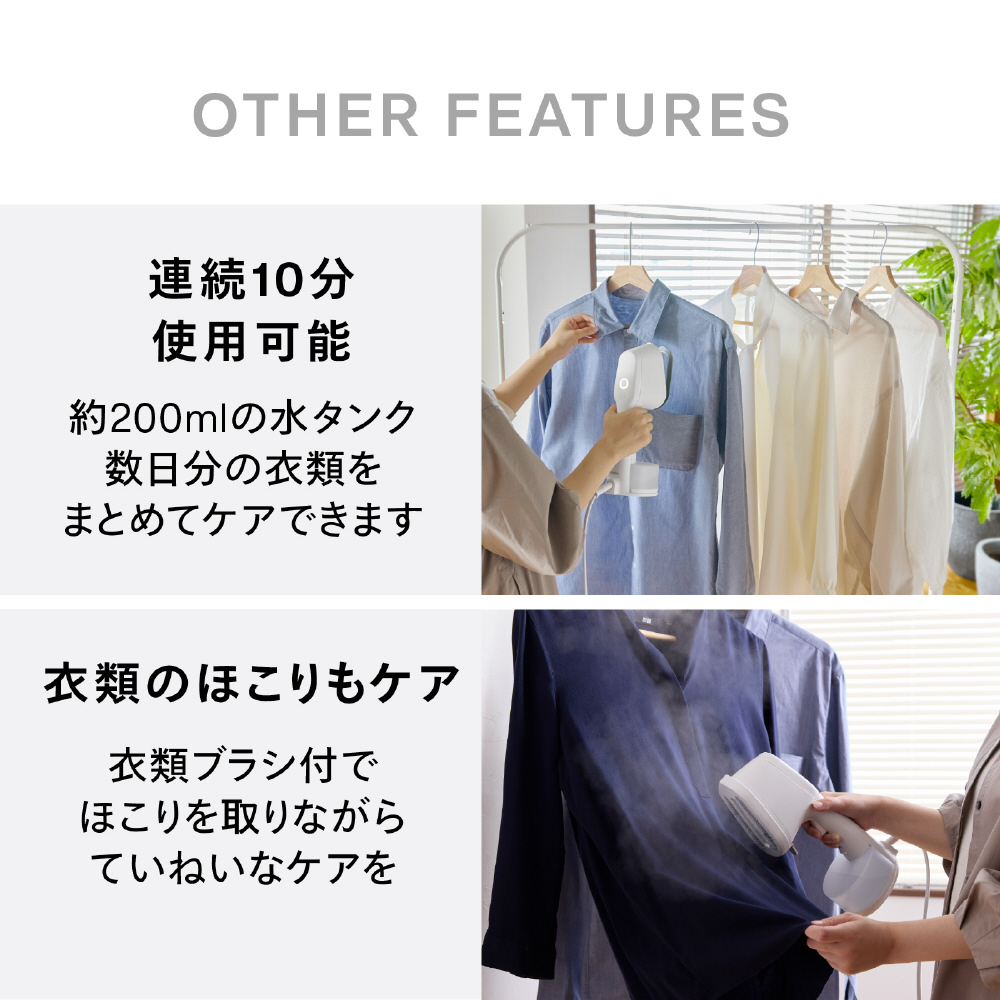 約20g/分のパワフルスチームでシャツやブラウスのシワやヨレを短時間で整えます。また、200mlの大容量水タンクを搭載し、約10分間スチームが持続するので、複数の衣類をまとめてケア可能です。忙しい日常でも、効率よく身だしなみを整えられます。