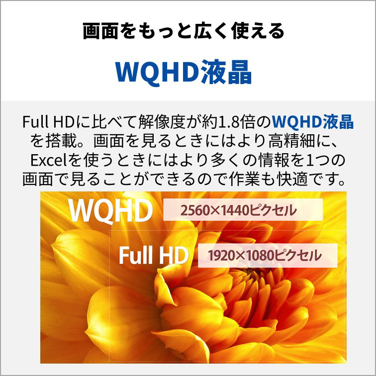 光の反射を抑え、見やすさと鮮やかさを両立した高輝度低反射液晶を搭載。暗いシーンを視聴している時にも、映り込みが少なく映像の世界に入り込むことができます。また、FullHDに比べて解像度が約1.8倍のWQHD高輝度低反射液晶を搭載。画像を見るときにはより高精細に、Excelを使うときにはより多くの情報を1つの画面で見ることができるので作業も快適です。