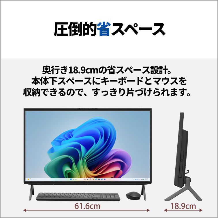 大画面でも奥行約18.9cm。キーボード・マウスも本体下に収納できるので置き場所に困りません。画面周りも狭額縁仕様なので、横幅も616mmと無駄なスペースをとりません。