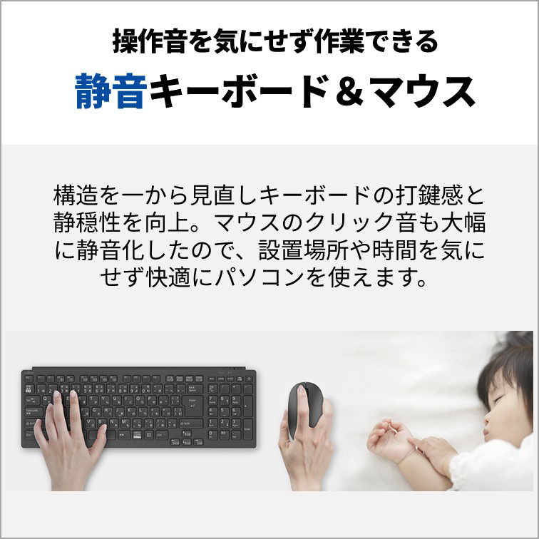 押し心地の良い約3mmのキーストロークを確保して、キーごとの反応過重までこだわり抜いたキーボードは、打鍵音も大幅に静音化。クリック音を大幅に静音化した静音マウスと合わせ、Web会議中の操作も夜中のWeb閲覧も周囲を気にすることなく快適にパソコンを使えます。