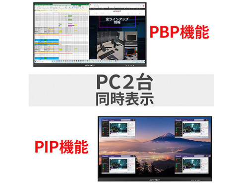 ■複数の入力映像を同時に表示するPIP(Picture In Picture)とPBP(Picture By Picture)に対応、PIPではもう一つの入力画面を子画面(左上/右上/左下/右下から選択)で同時表示が可能。PBPでは2つの入力を左右に同時表示することが可能です。