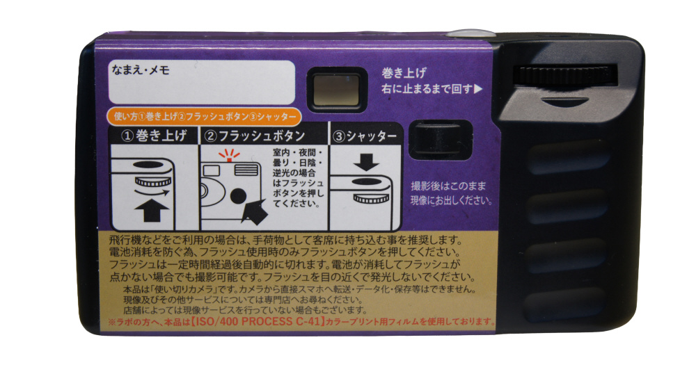 | 仕様2 | ・135/35MMフィルム・ISO/400 PROCESS C-41 カラーフィルム・フィルム枚数:12枚・シャッタースピード:1/120秒・撮影距離:フラッシュ撮影1~3m、日中・屋外撮影1m~無限大 ※晴れ~薄曇りの日中・屋外ではフラッシュなしでも撮影可・バッテリー:単三アルカリ乾電池1本内蔵 |