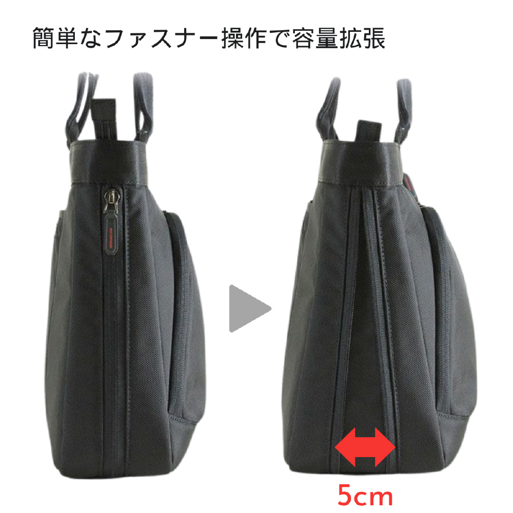 ファスナーを開くことで底幅が約5cm広がり、荷物が増えた際にも収納スペースを確保できます。