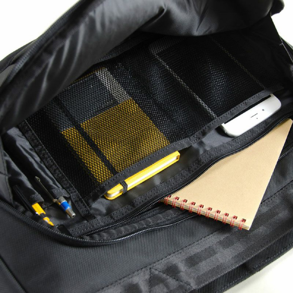 本体内部にはクッション材入りのPCポケットとメッシュポケットを備え、PCや書類の収納に対応します。