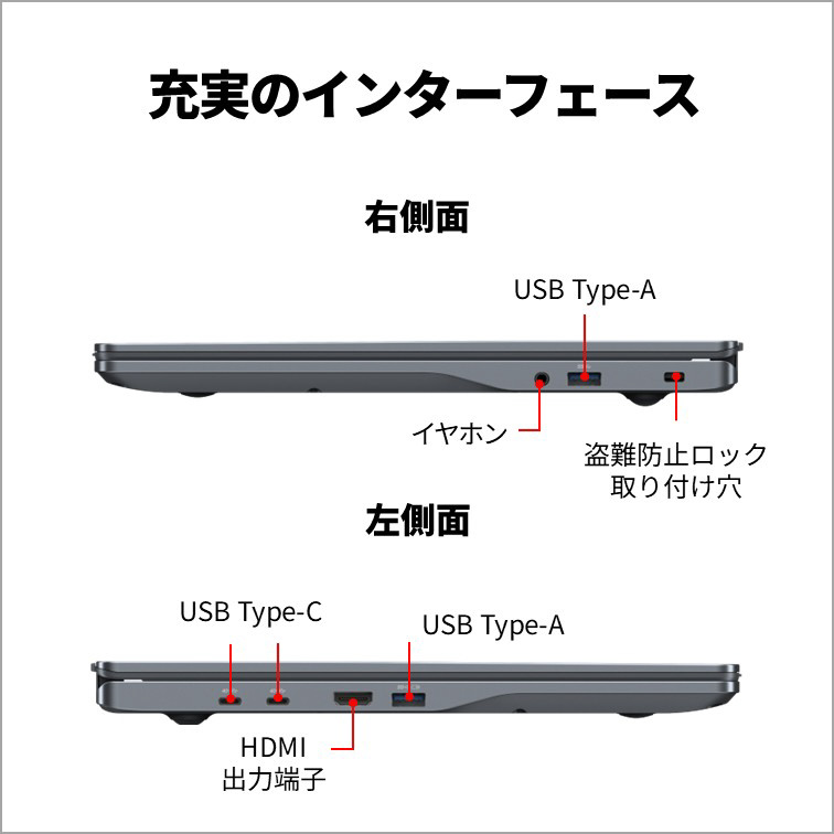 | インターフェイス | [USB-C]USB4 Gen3x2 x2(USB Power Delivery対応、DisplayPort Alt Mode対応) [USB-A]USB3.2 Gen1 x2(うち1つは電源オフUSB充電機能付) [映像入出力]HDMI出力端子 x1 [オーディオ]φ3.5mmステレオ・ミニジャック x1(マイク・ラインイン・ヘッドホン・ラインアウト・ヘッドセット兼用端子) |