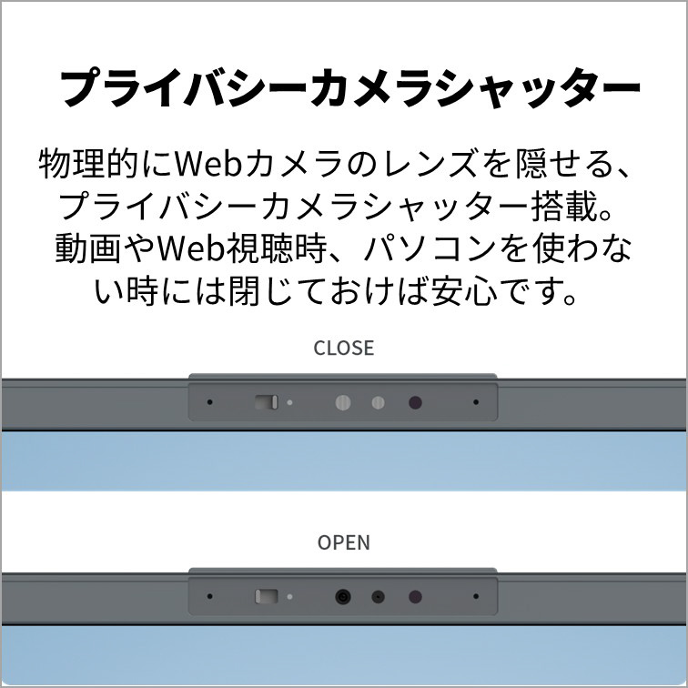 | WEBカメラ | 5MP Webカメラ内蔵(プライバシーカメラシャッター付)(有効画素数 約500万画素)Windows Hello対応 |