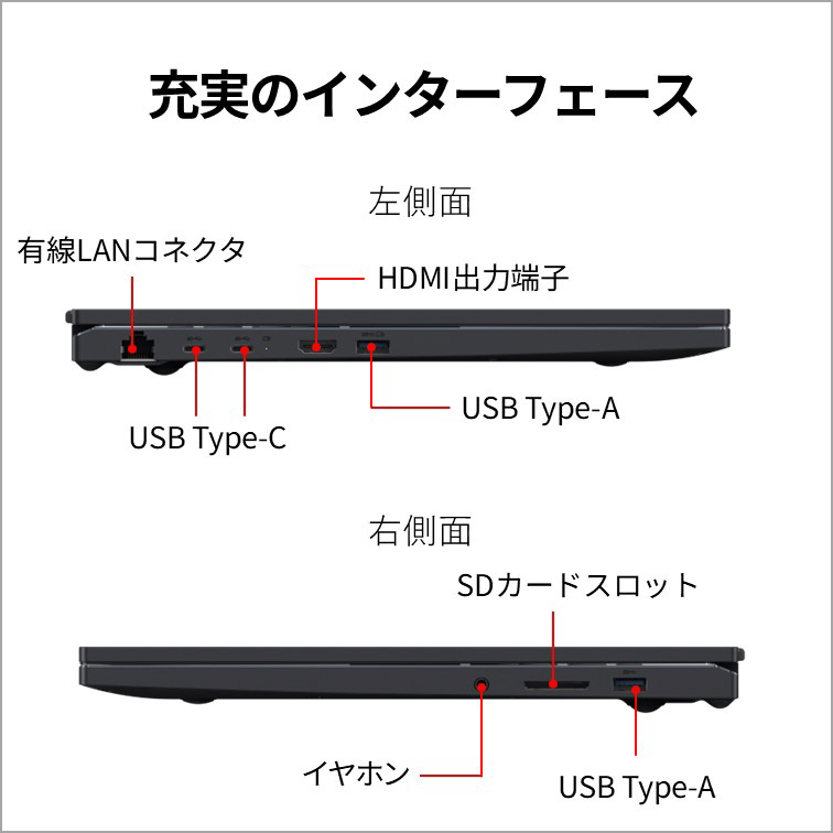 | インターフェイス | [ダイレクト・メモリースロット]SDメモリーカード対応 x1 [USB-C]USB4 Gen3x2 x2(USB Power Delivery対応、DisplayPort Alt Mode対応) [USB-A]USB3.2 Gen1 x2(うち1つは電源オフUSB充電機能付) [映像入出力]HDMI出力端子 x1 [オーディオ]φ3.5mmステレオ・ミニジャック x1(マイク・ラインイン・ヘッドホン・ラインアウト・ヘッドセット兼用端子) |