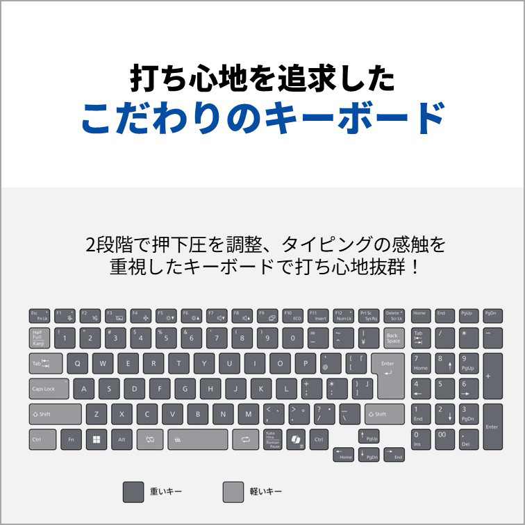 小指で打つキーは弱い力で反応するなど、タッチタイピングの際の指の力に合わせてキーの重さを2段階に調整し、心地よい打鍵感を求めました。
