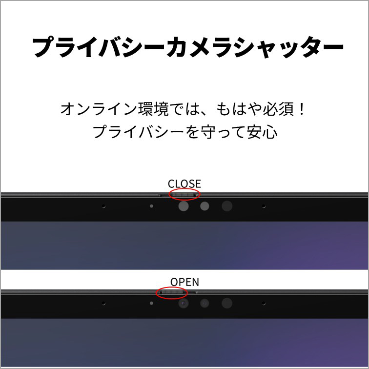 WindowsHello対応顔認証カメラ搭載。使わないときはプライバシーカメラシャッターを閉じておけばプライバシーも安心です。
