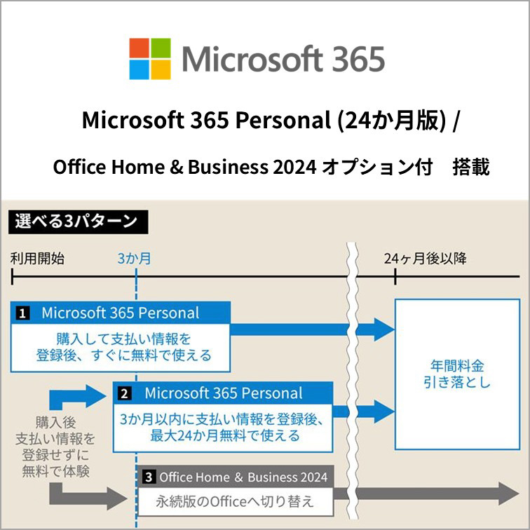 | Officeソフト | Microsoft 365 Personal (24か月版) / Office Home & Business 2024オプション付 |