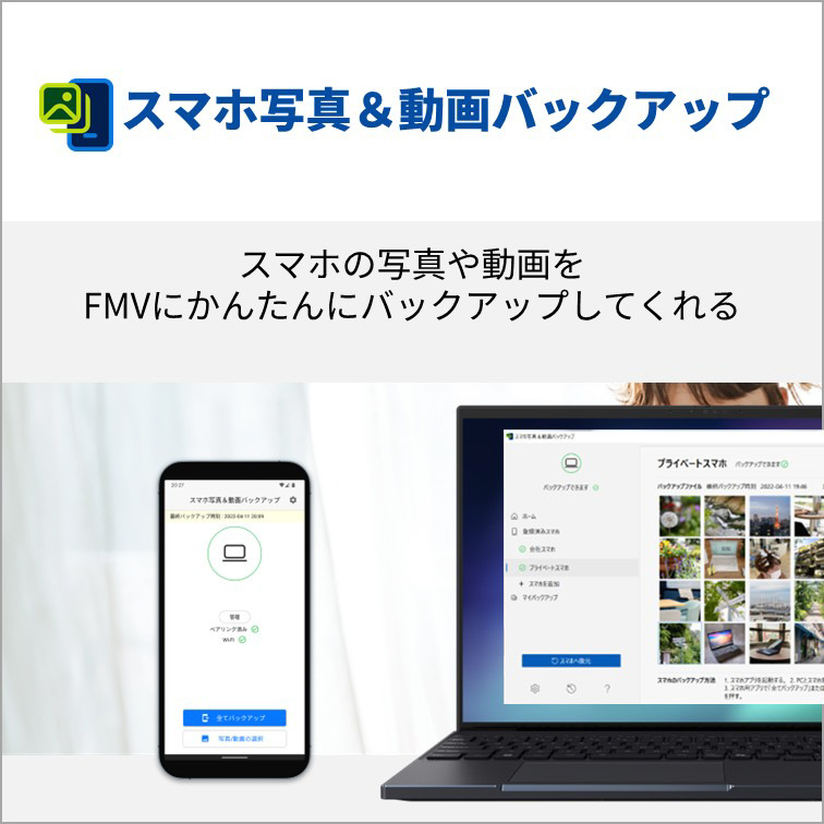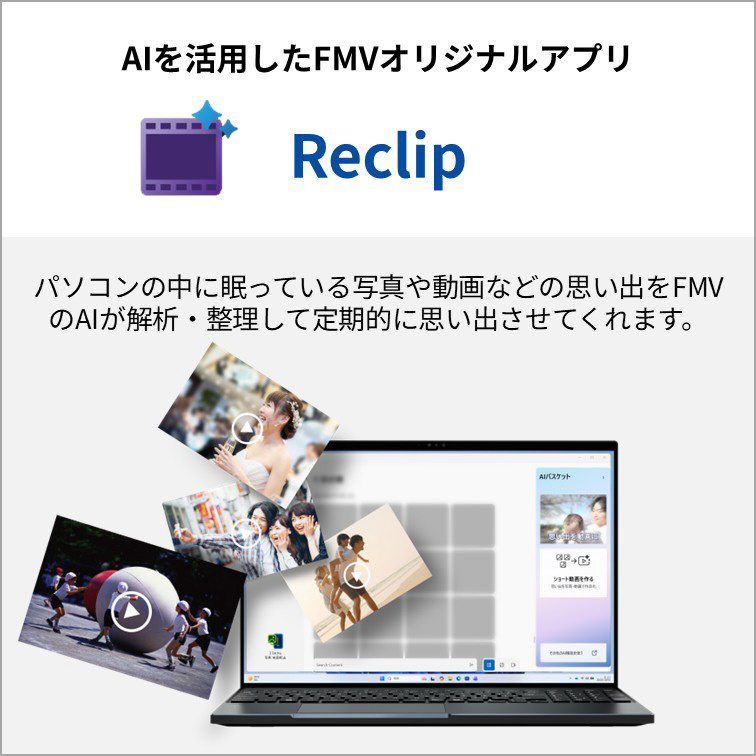 パソコンに取り込んだ動画や写真の自動整理から、ハイライト動画の作成までを簡単なステップで行えます。パソコンの中で眠っている写真や動画を、FMVのAIが自動で解析・整理します。
