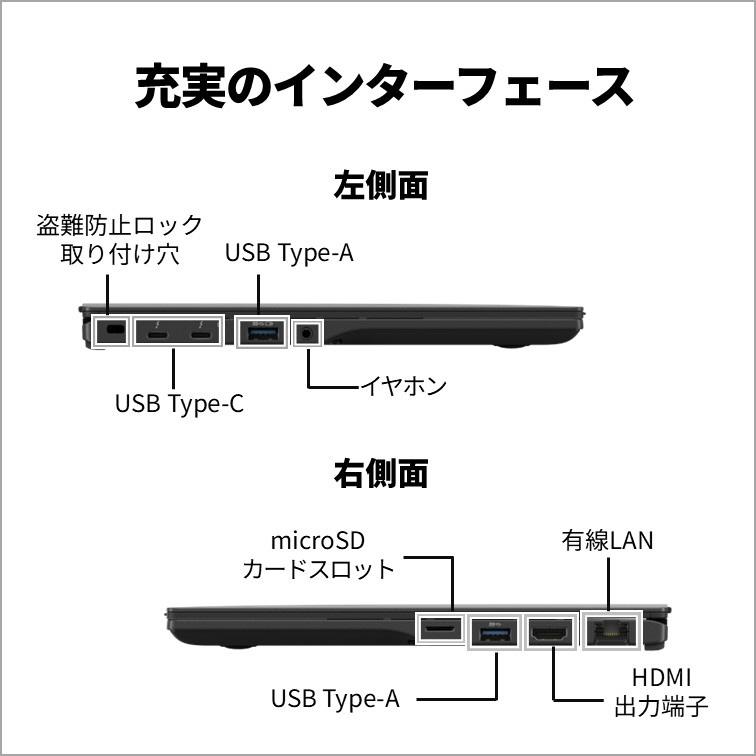 軽量・コンパクトなボディに充実のコネクタ類を搭載しています。出先で変換ケーブルが無くて困るようなことはありません。USB Type-C(Thunderbolt4対応)コネクタを2つ搭載し、更に多くの機器とつながるようになりました。