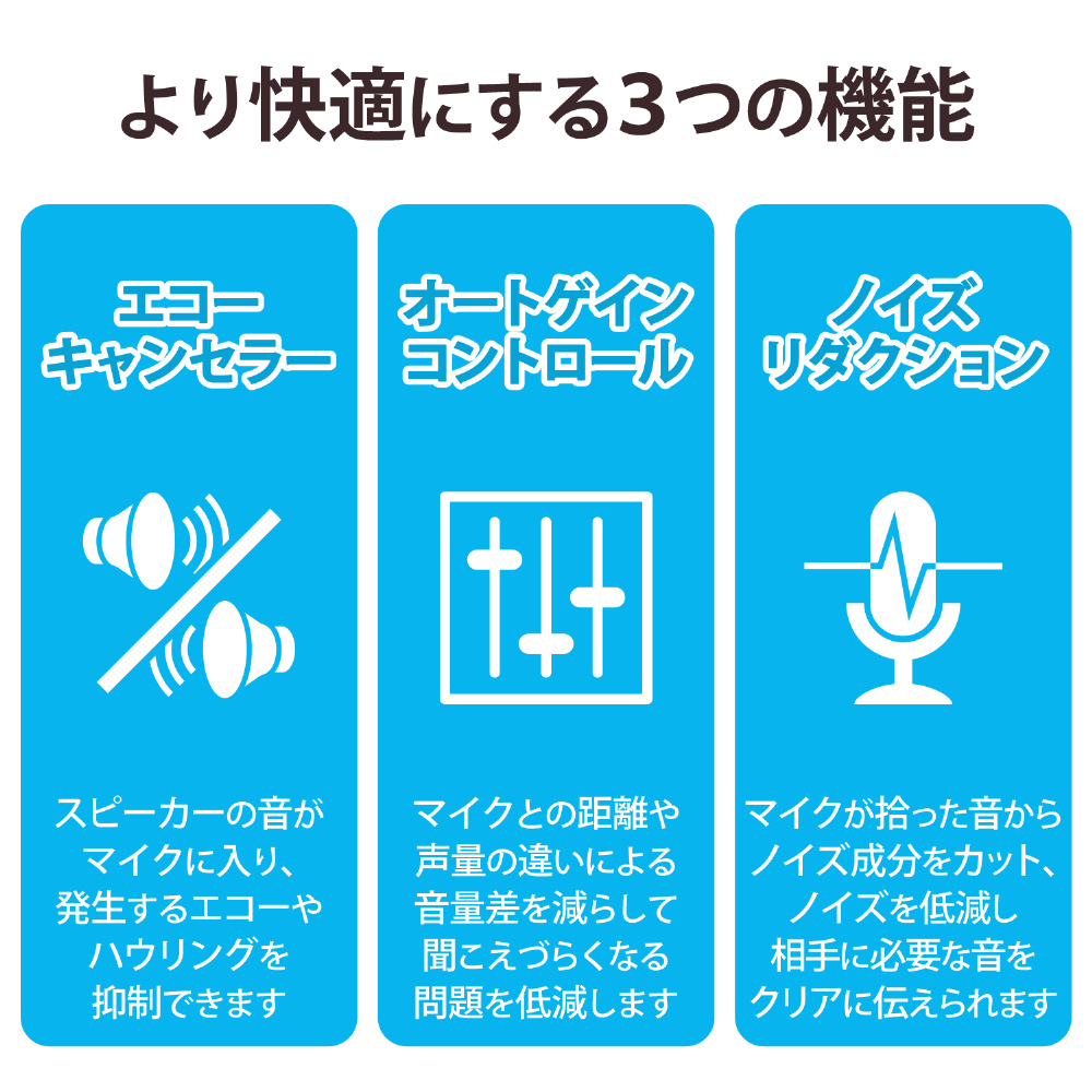 エコーキャンセラー機能により、スピーカーからの音をマイクが拾ってしまうことで生じるエコーやハウリングを抑制します。