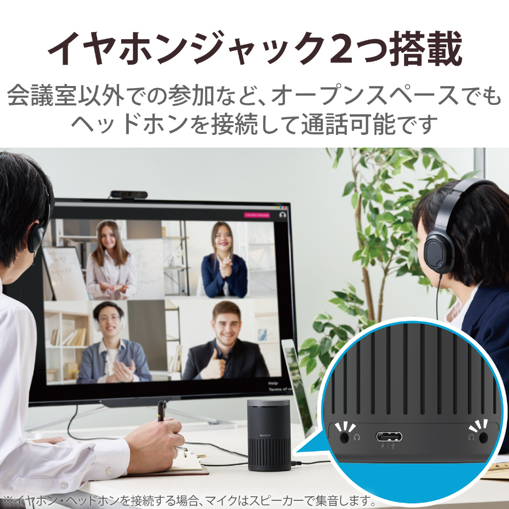 φ3.5mmステレオミニジャックを2つ搭載。ヘッドセットを接続すれば、オフィスで複数人がWeb会議に参加する際も、周囲に聞かれず通話可能です。