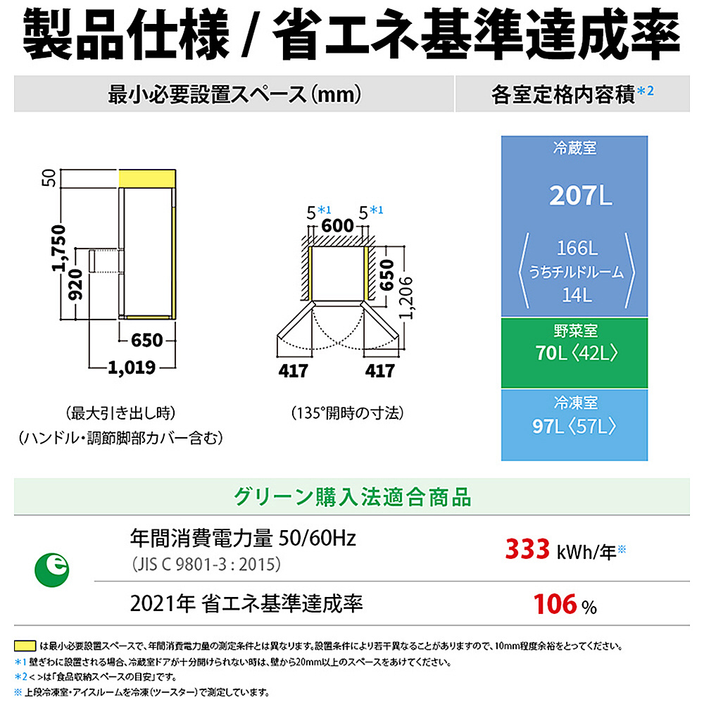 真ん中野菜室レイアウト、どっちもドアタイプ。キッチンにスッキリ設置できる奥行薄型65cmで最上段までラクに手が届く、ちょっと低め175cm。