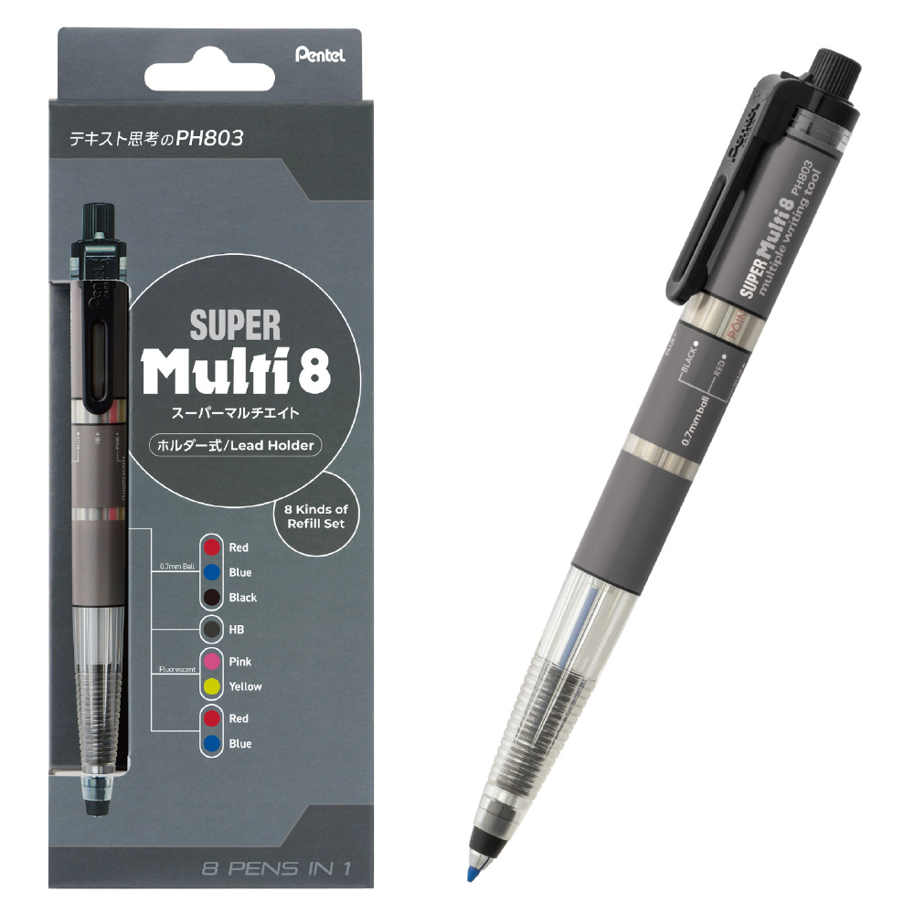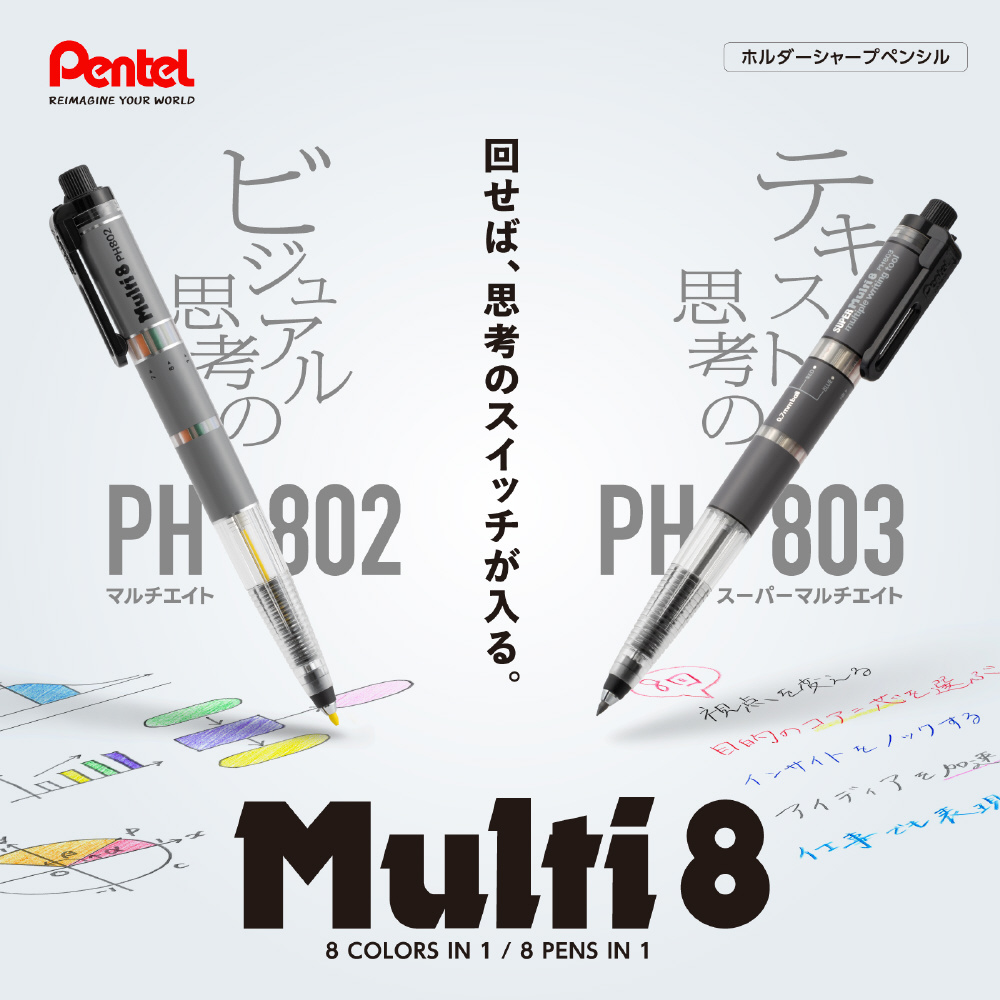 マルチ8シリーズは“思考と創造を支えるトータルツールブランド”として2026年リニューアルします。マルチ8、スーパーマルチ8はその1本で情報整理が可能で、思考を加速させるツールです。マルチ8(PH802)はアイデアや情報を絵や図などで捉えるビジュアル思考派に、スーパーマルチ8(PH803)は文章や言語情報で捉えるテキスト思考派にオススメです。
