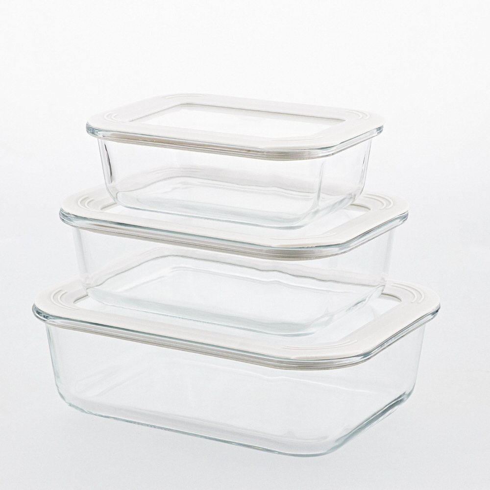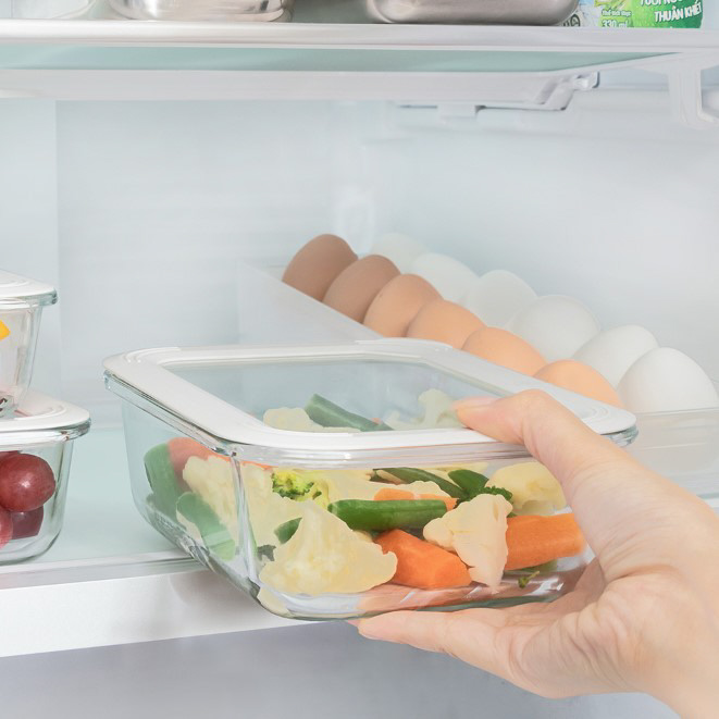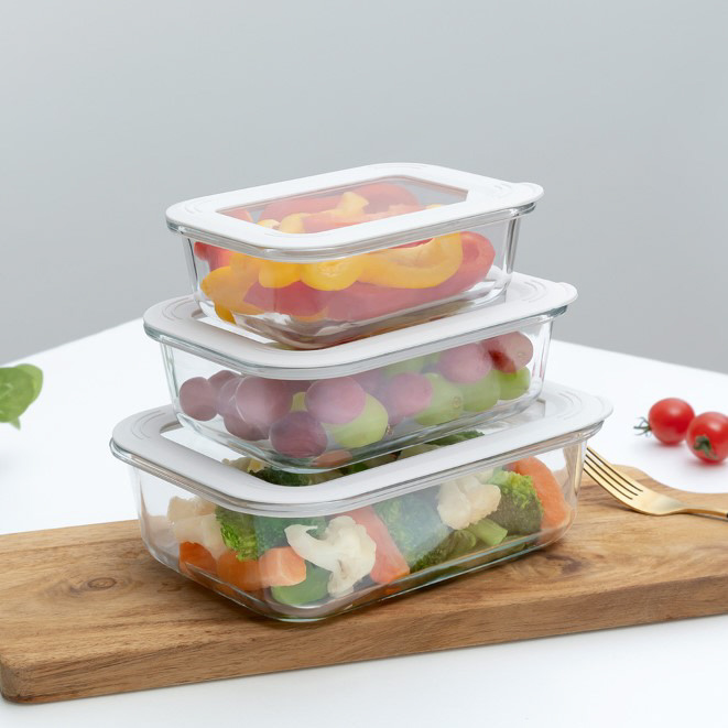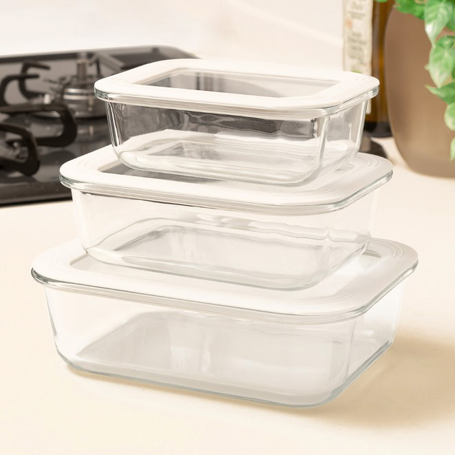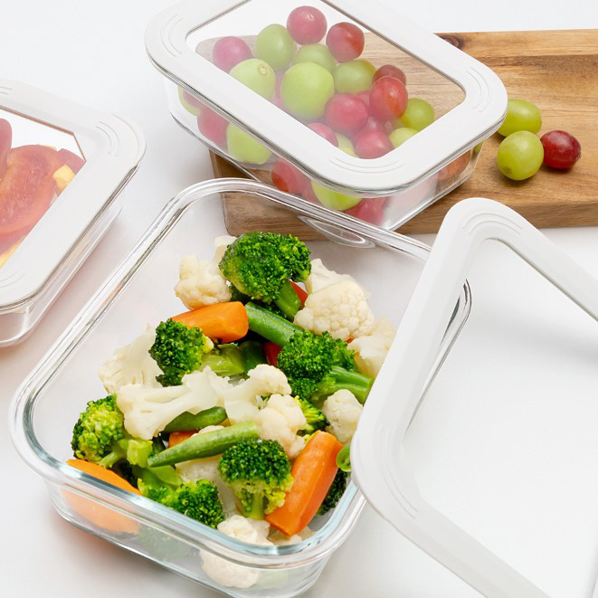 ワンプッシュで簡単に密閉されるガラス保存容器。
