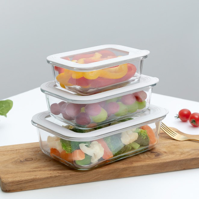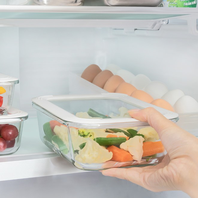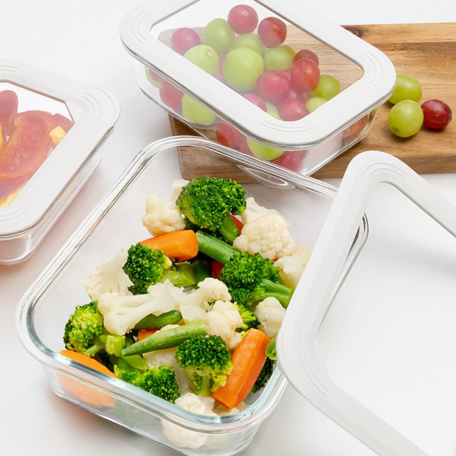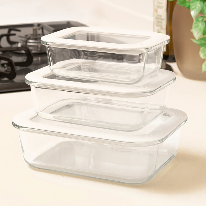 ワンプッシュで簡単に密閉されるガラス保存容器。