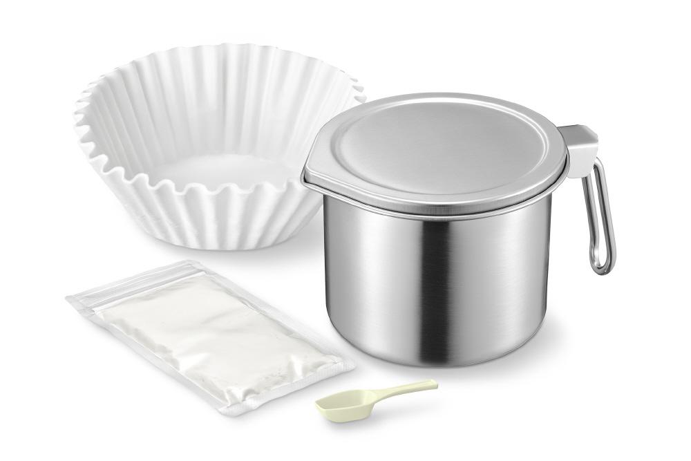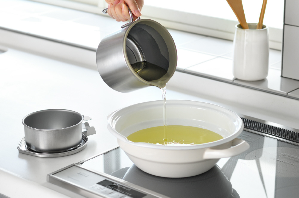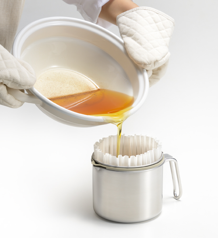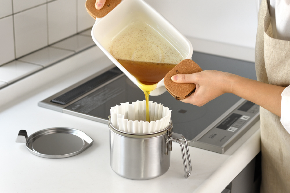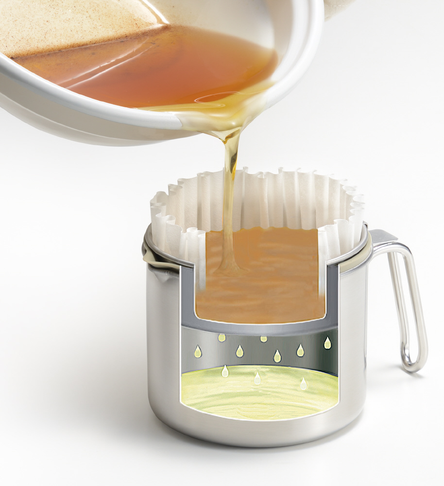 ろ過パウダーで油の汚れを吸着し、キレイな油に
