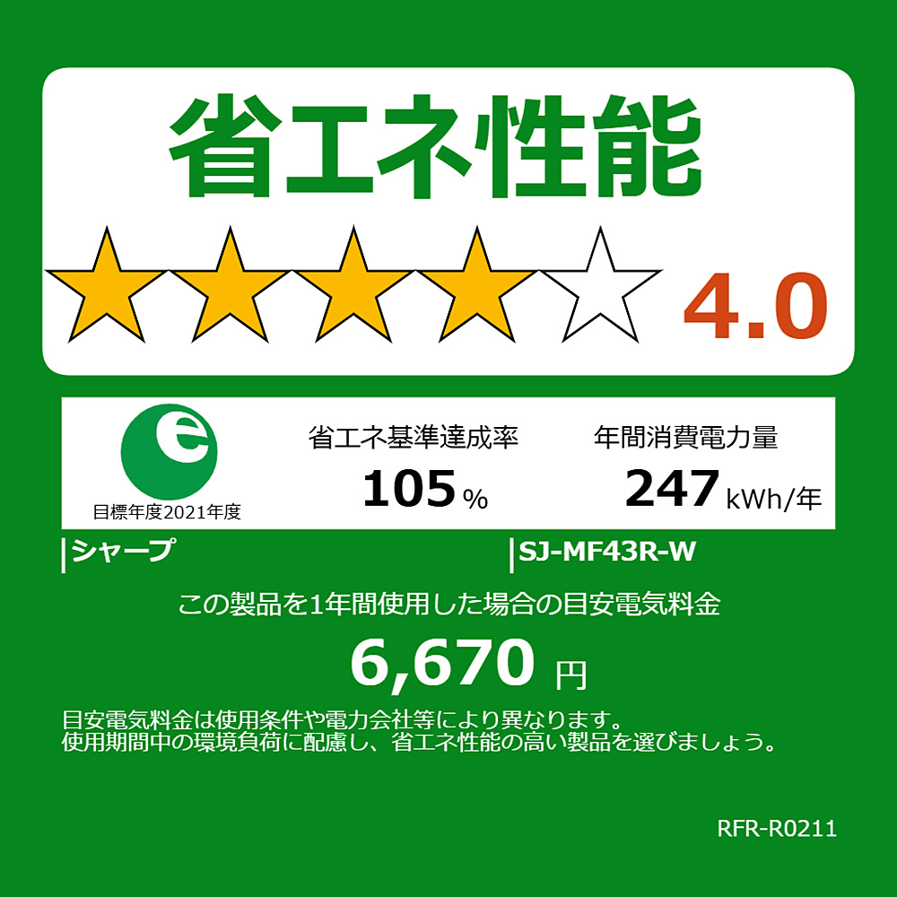 ※3 節電25モード(自動製氷一時停止モード時)と通常運転(自動製氷運転時)との比較。電力の消費を抑えた運転をするために、食品保存に影響を及ぼさない範囲で、庫内温度を約1℃高めに設定します。設定温度「中」、新鮮冷凍「切」、周囲温度35℃、ドア開閉なしでの1日当たりの消費電力量から算出。SJ-MF43P(SJ-MF43Rと同等): 通常運転(自動製氷運転時)1.538kWh→節電25モード(自動製氷一時停止モード時)1.130kWh。JIS C 9801-3:2015測定基準とは異なります。使用環境(温度調節・周囲温度・ドア開閉頻度・食品の量など)により節電効果は異なります。