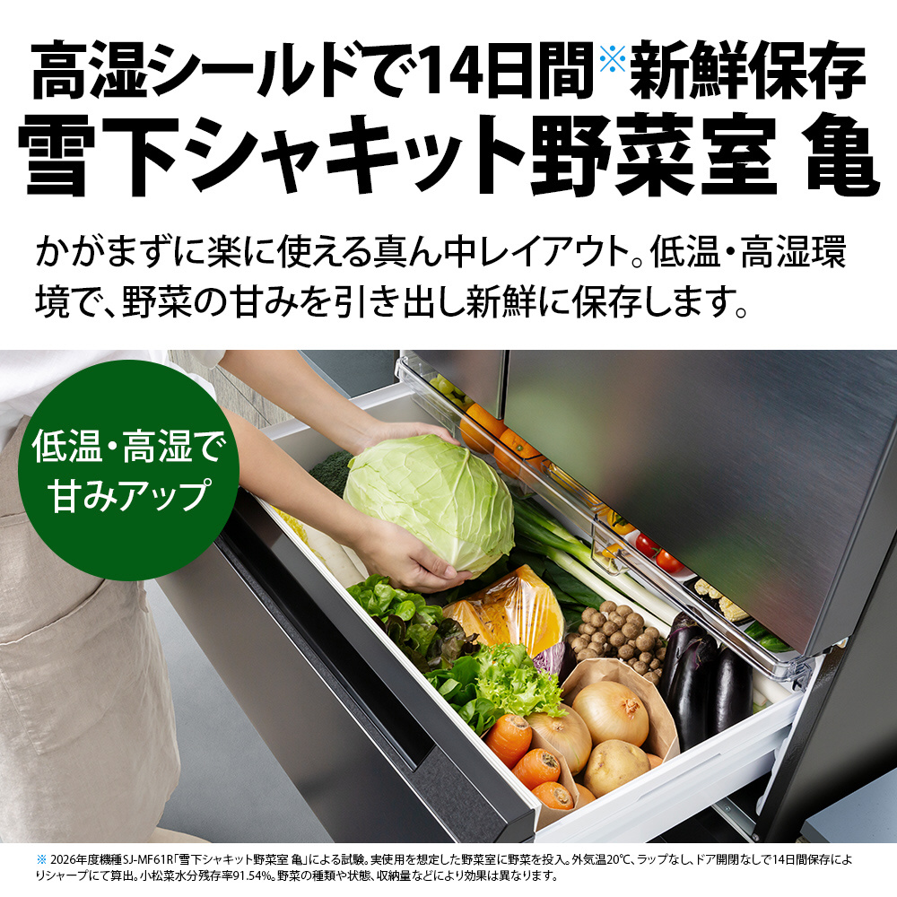 ※1 2026年度機種SJ-MF61R「雪下シャキット野菜室 亀」による試験。実使用を想定した野菜室に野菜を投入。外気温20℃、ラップなし、ドア開閉なし、チルドモードONで14日間保存により当社にて算出。野菜の種類や状態、収納量などにより効果は異なります。