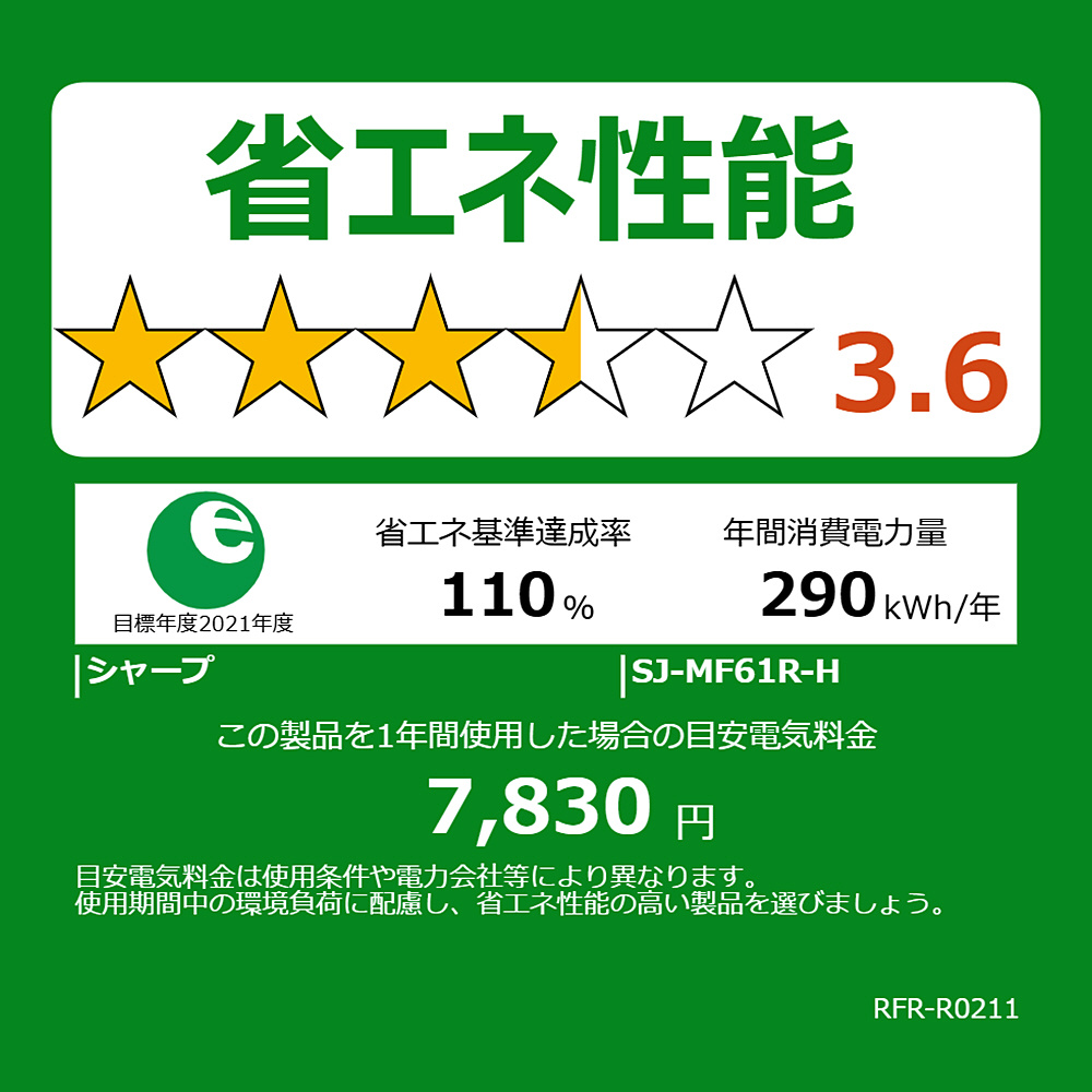 ※5 節電25モード(自動製氷一時停止モード時)と通常運転(自動製氷運転時)との比較。電力の消費を抑えた運転をするために、食品保存に影響を及ぼさない範囲で、庫内温度を約1℃高めに設定します。設定温度「中」、新鮮冷凍「切」、周囲温度35℃、ドア開閉なしでの1日当たりの消費電力量から算出。SJ-MF61R:通常運転(自動製氷運転時)1.788kWh→節電25モード(自動製氷一時停止モード時)1.294kWh。JIS C 9801-3:2015測定基準とは異なります。使用環境(温度調節・周囲温度・ドア開閉頻度・食品の量など)により節電効果は異なります。