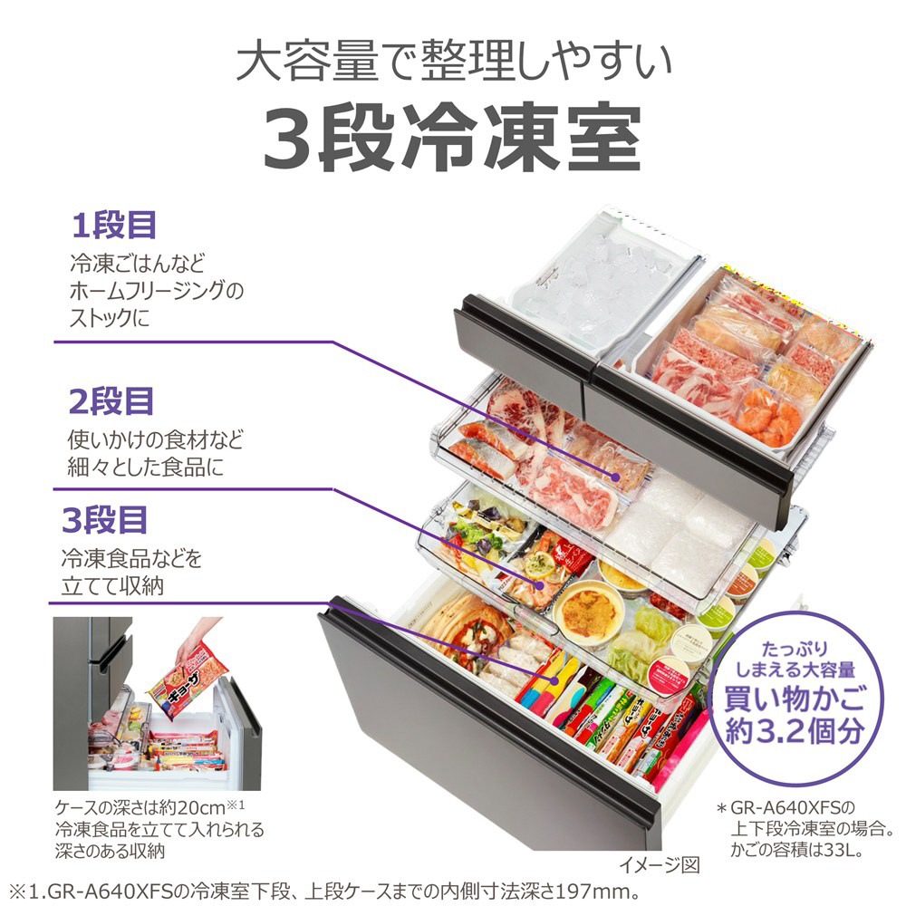 高い保存性能で暮らしにゆとりと快適さをお届けするフラッグシップモデル「VEGETA XFSシリーズ」。まとめ買いも安心大容量。作り置きのおかずや余ったごはんを凍らせずに約7日間保存可能「Deliチルド」搭載。