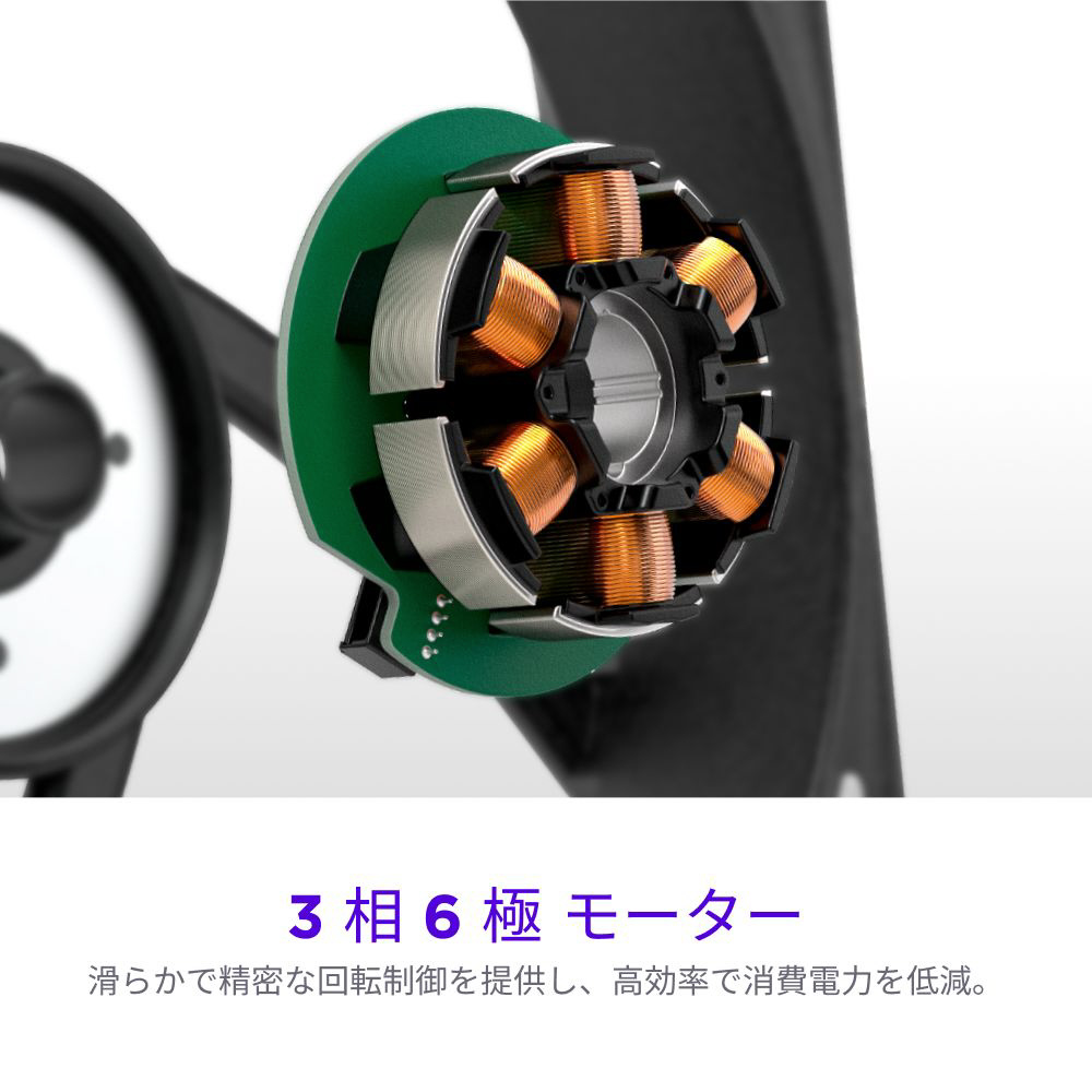 LCP構造、最適化されたブレード、ハイブリッドベアリングシステムにより、強力で静かな冷却性能を実現。