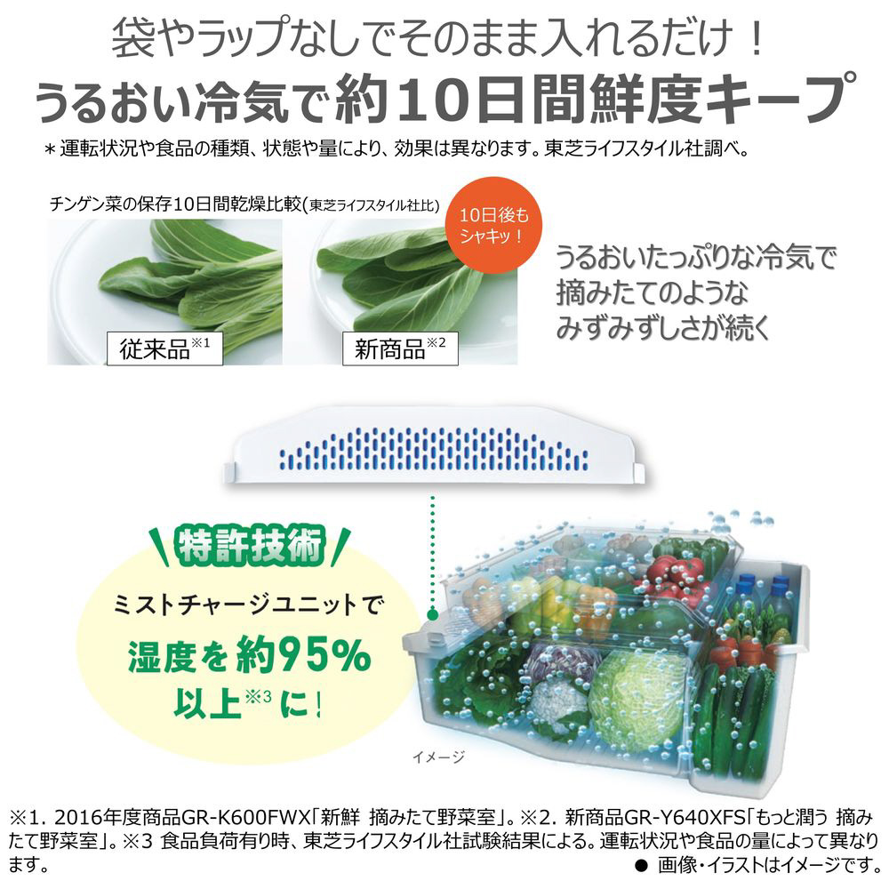 ■丸ごと野菜も使いかけ野菜も約10日間新鮮保存「もっと潤う摘みたて野菜室」