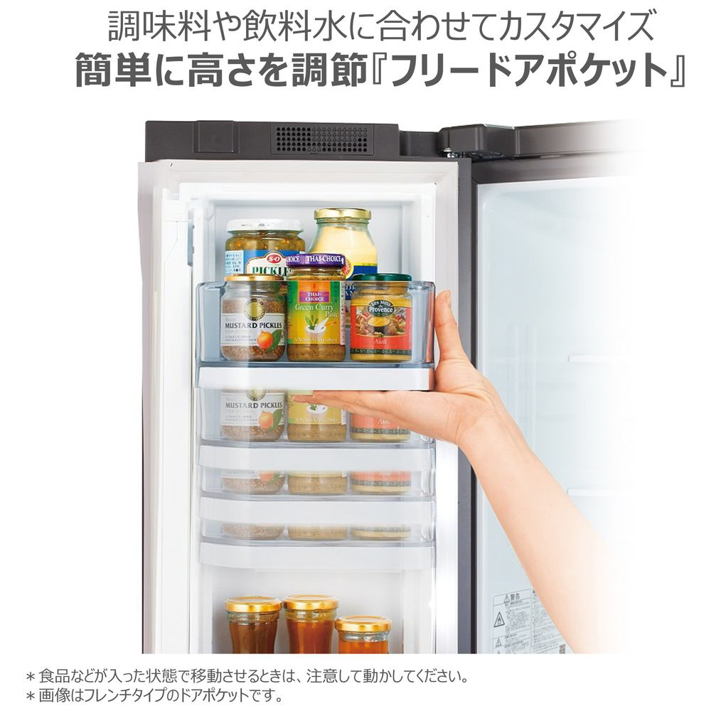 様々な大きさのドレッシングや調味料に合わせて高さを自由に変えられます。あと少しで入るのに入らないに対応ストレスフリーのドアポケットで日々の収納の悩みを解決!