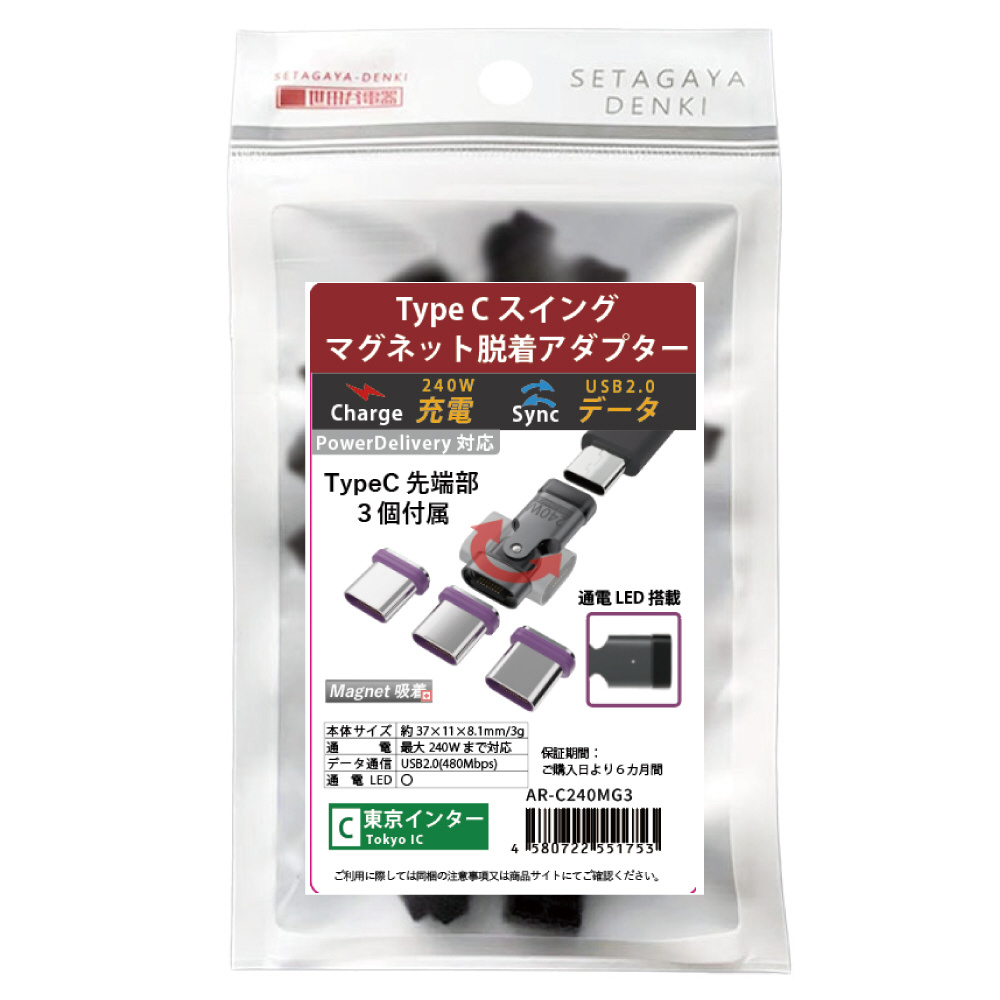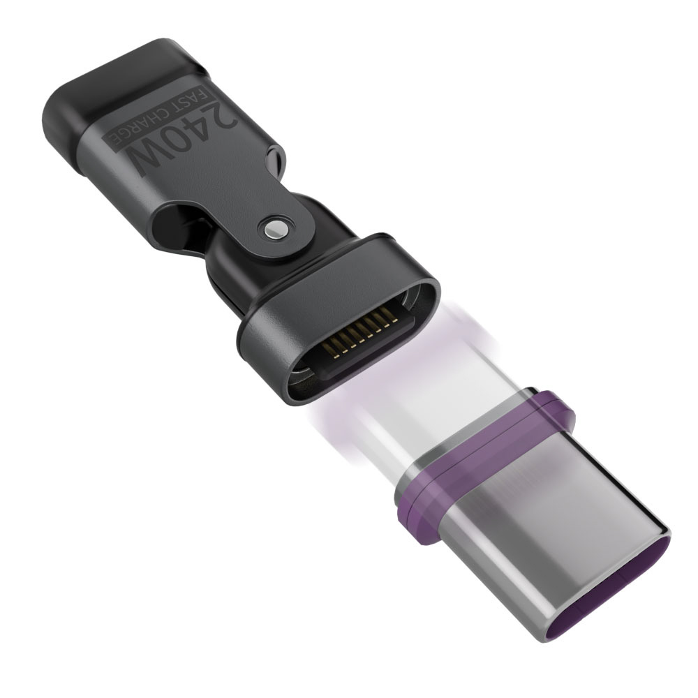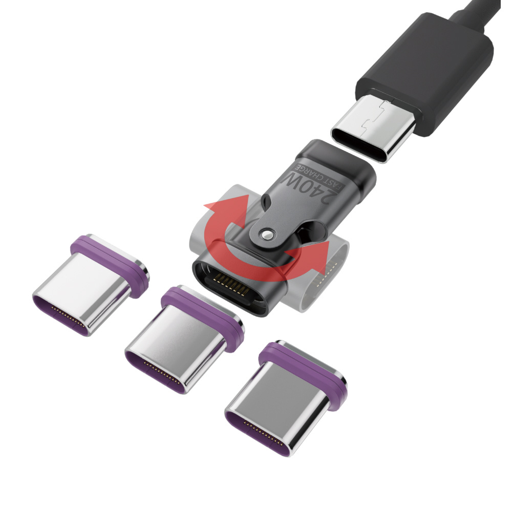 Type-Cケーブルを磁石で簡単脱着できるマグネットアダプター。240W(48V/5A)の高速充電とUSB2.0データ転送に対応し、180度可動するスイング機構で充電中のゲームプレイや動画視聴も快適。Type-C先端部を3個付属し、スマートフォンやノートPC、タブレットなど複数のデバイスに装着しておけば、ケーブル1本で瞬時に充電可能です。