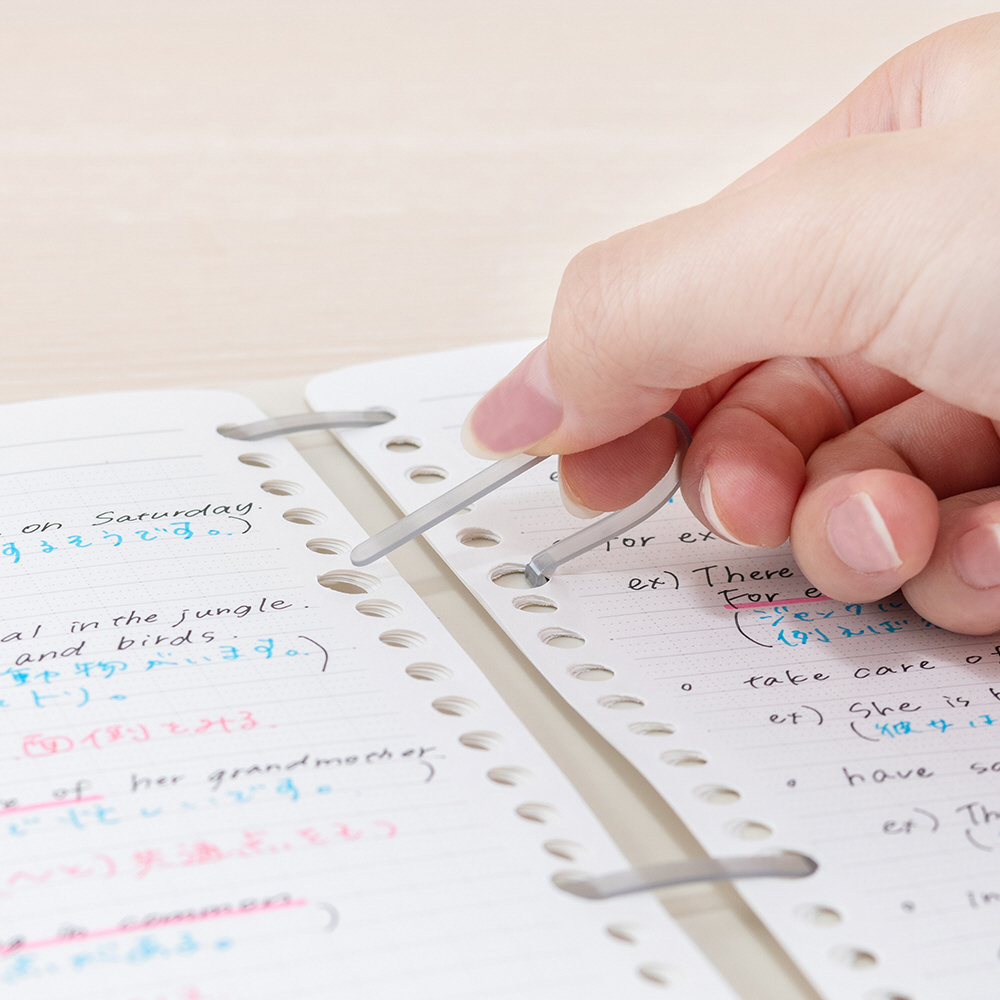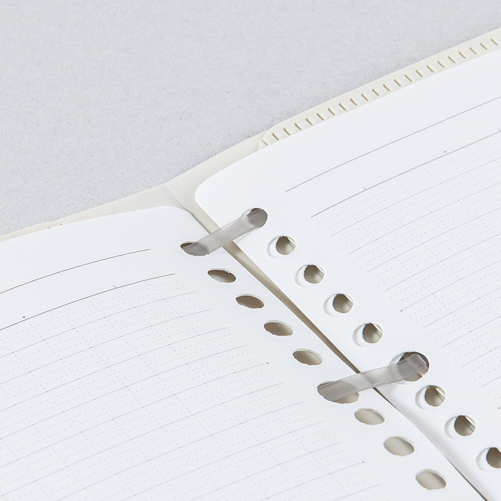 ●材質:表紙=ポリプロピレン表紙(0.4mm厚)、綴具=4穴フラットバー式樹脂製綴具、本文=上質紙・70g/m2・B罫(6mm)・29行・10枚・20穴