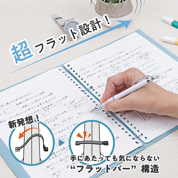 FLALEAF(フラリーフ)はリングの厚みを解消し、フラットを追求した新感覚のバインダーノートです。独自開発の超薄型綴具「フラットバー」を採用し、筆記時に手に当たっても気にならない薄さを実現しました。左右2本ずつ計4本のフラットバーを互い違いにしっかりと綴じ込み固定するため、安定した筆記が可能です。かさばらないので、ノート感覚でスマートに持ち運ぶことができます。最大50枚までのリーフの差し替え、追加が可能です。