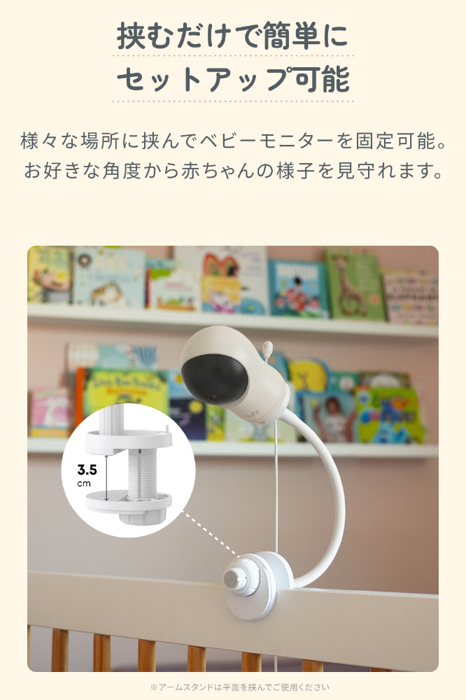 ベビーモニターの置き場がなくても、ベビーベッドの柵などに取り付け可能。