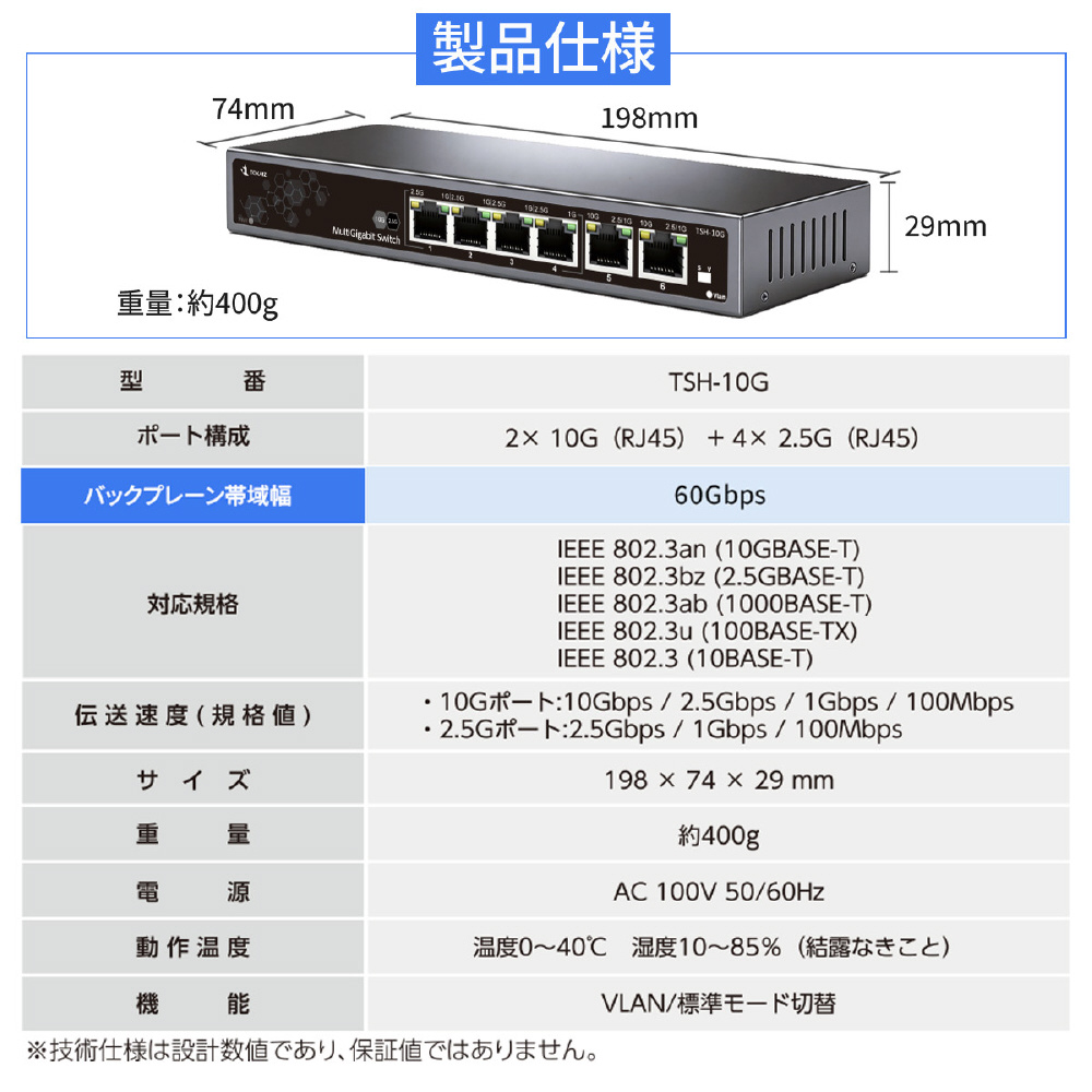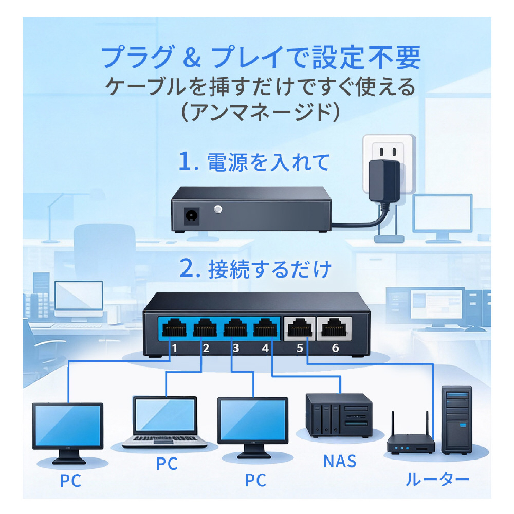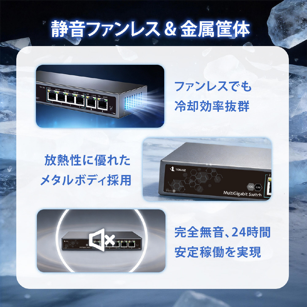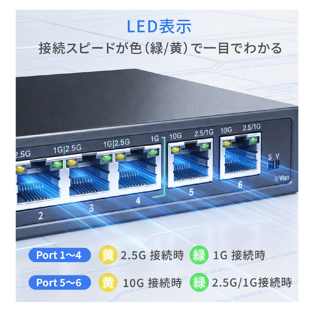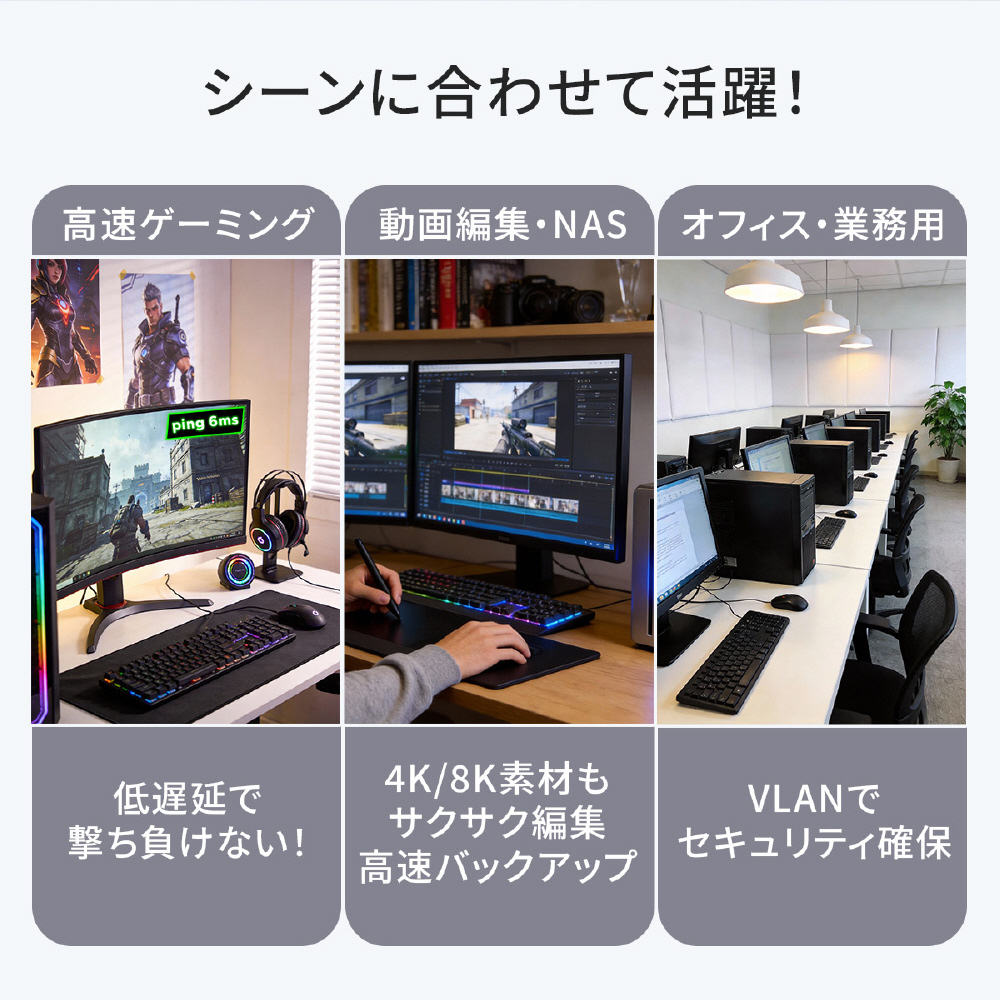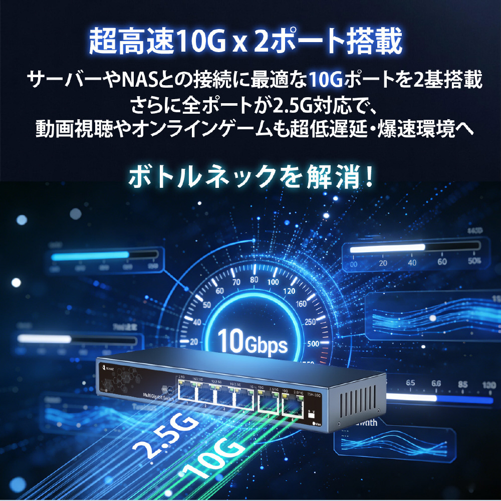 10Gポート2基と2.5Gポート4基の計6ポートすべてが高精度な爆速仕様、VLANによる強固な通信遮断と静寂を極めたファンレス金属筐体を兼ね備え、動画編集からプロゲーミング、オフィス運用まであらゆる環境のボトルネックを根底から覆す次世代のネットワーク基盤。