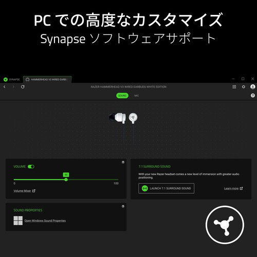[サラウンド]Razer Synapseソフトウェア経由で、7.1THXサラウンドサウンド有効化可能(Windows OSのみ)